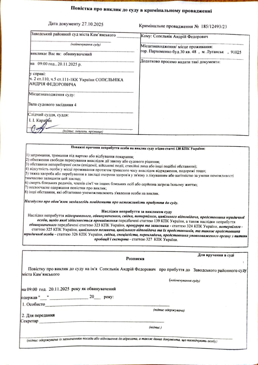 Summons on the summons of A.F. Sopelnyk. to the Factory District Court of Kamianske on November 20, 2025 at 09:00