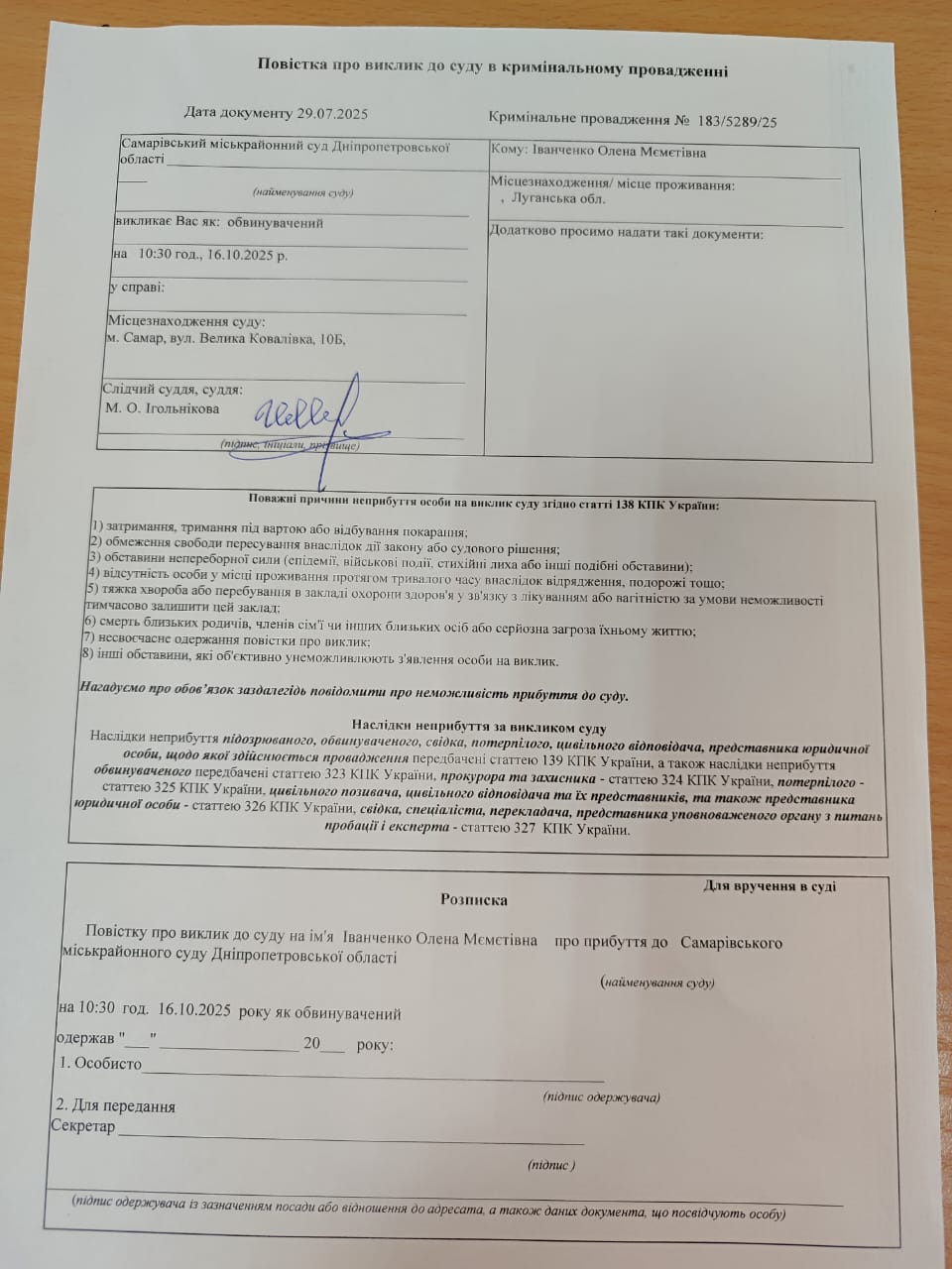 Summons to appear at the Samariy District Court of Dnipropetrovsk Region as the accused Olena Miemetivna Ivanchенко on October 16, 2025, at 10:30 AM