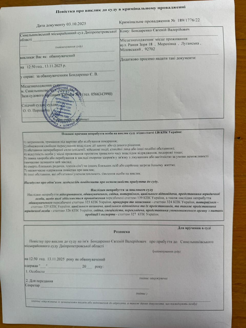Summons for the court appearance of Bondarenko Y.V. on 13.11.2025