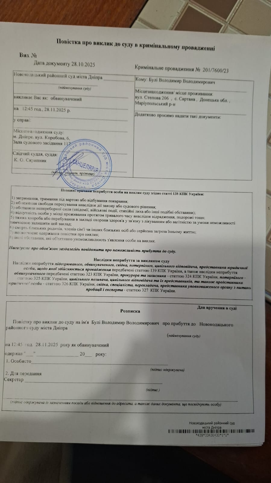 Summons to summon to the court Buli V.V. on 28.11.2025