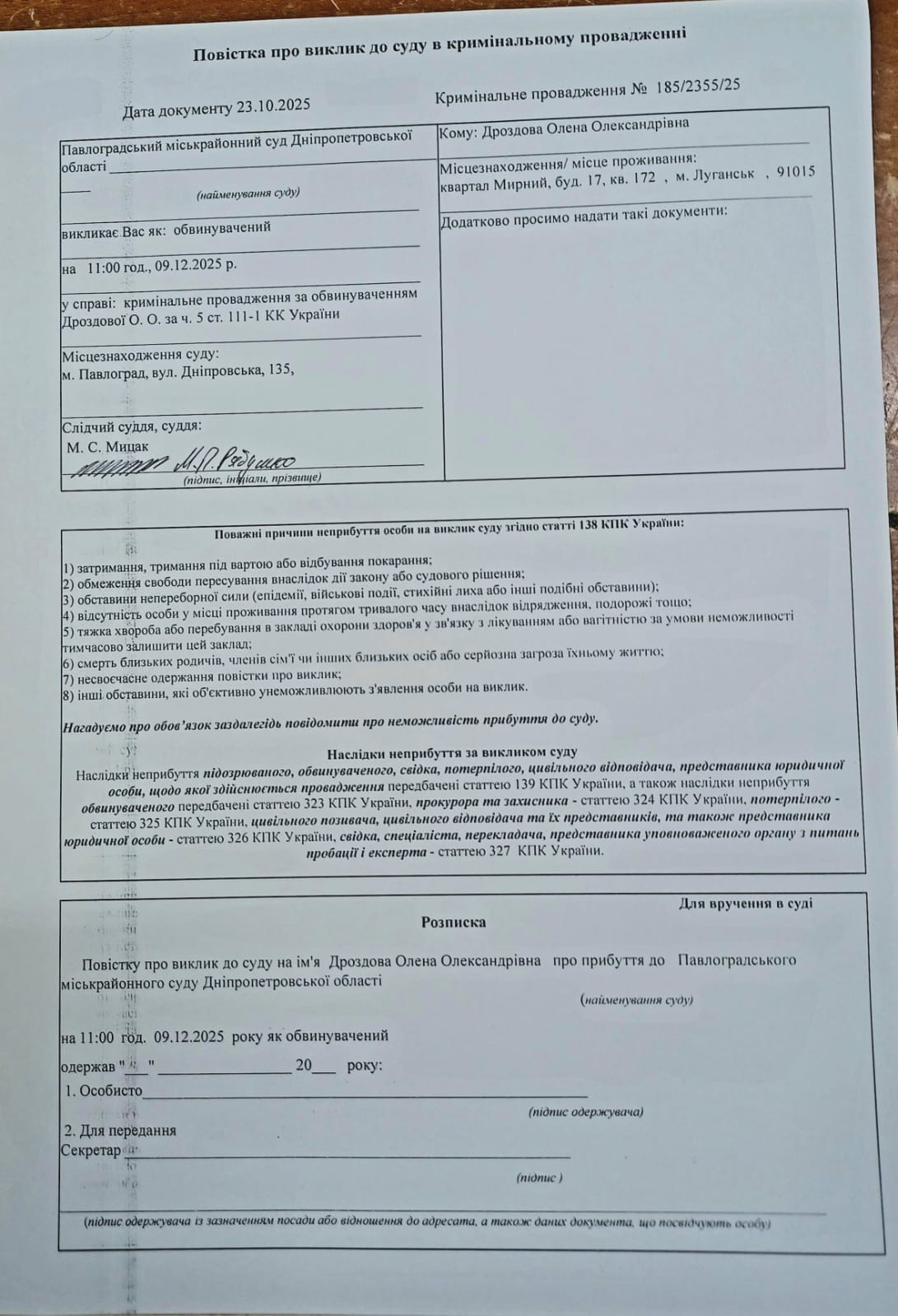 Summons on the summons to the court Drozdova O.O. on 09.12.2025 at 11.00
