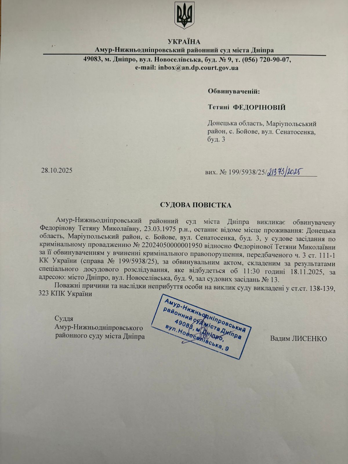 Summons for T.M. Fedorinova to appear in court on 18.11.2025