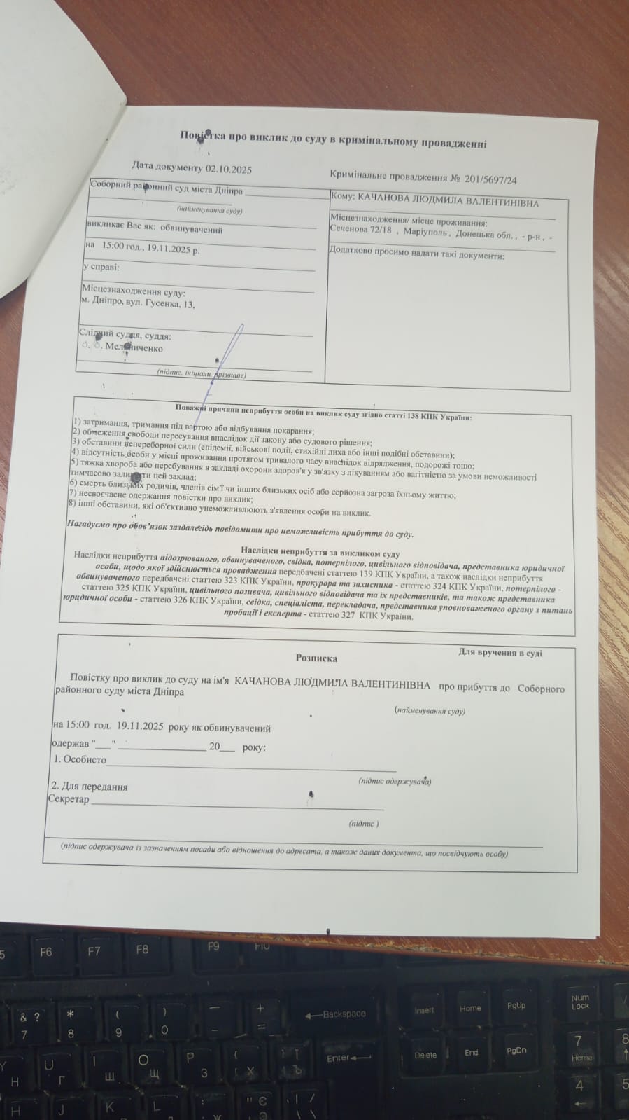 Summons for Kachanova L.V. to appear in court on 19.11.2025