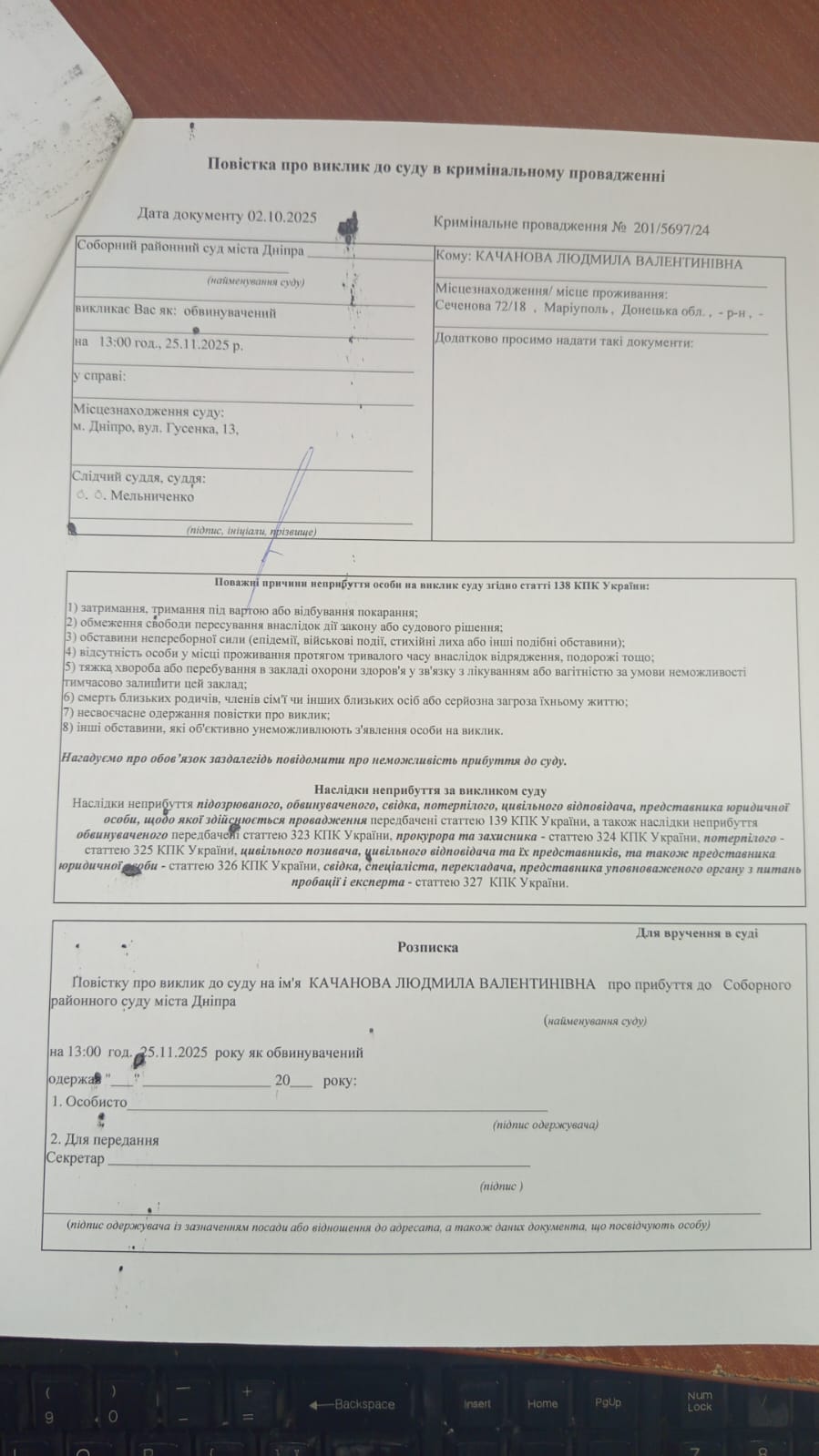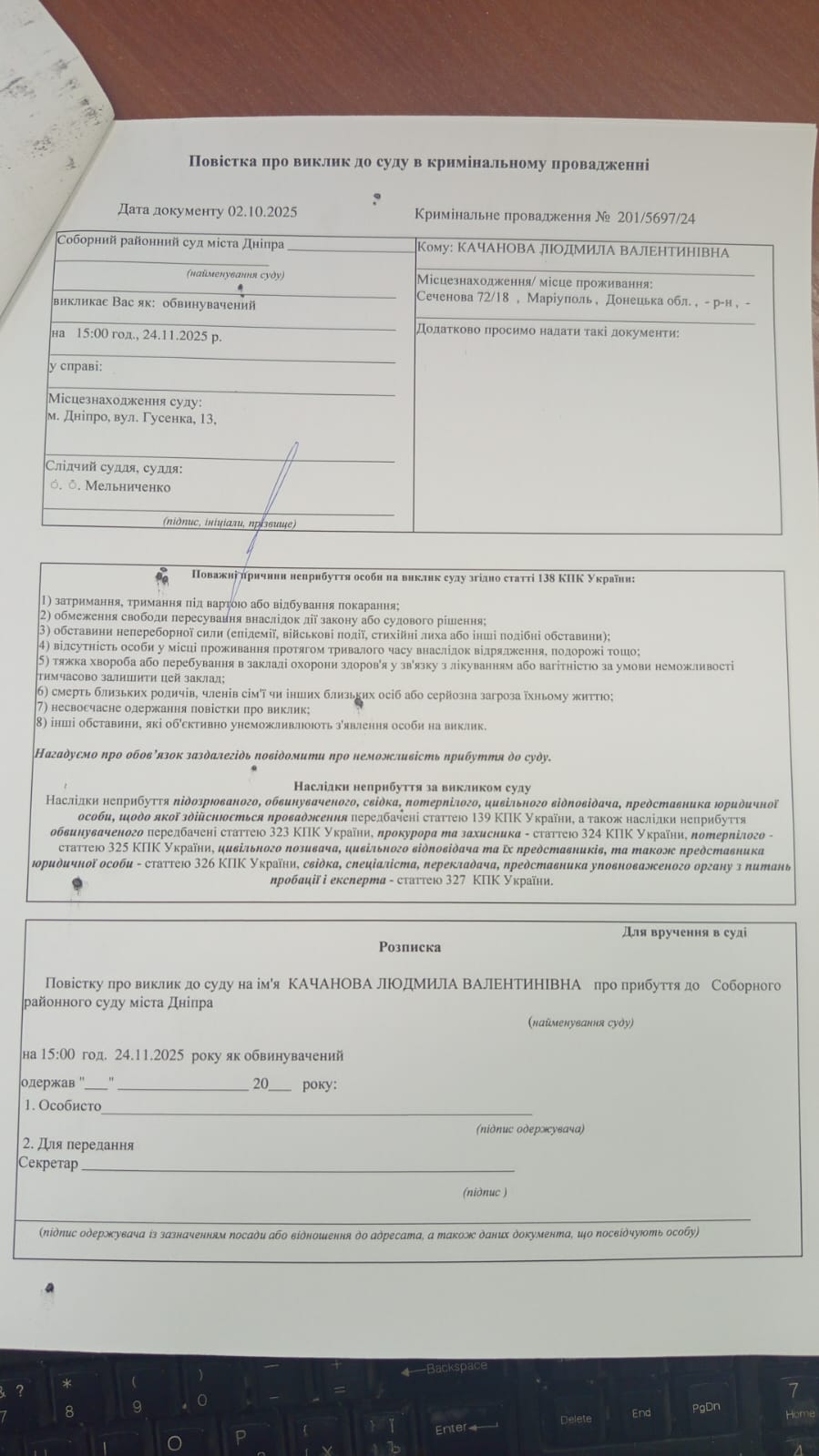 ПSummons for Kachanova L.V. to appear in court on 24.11.2025