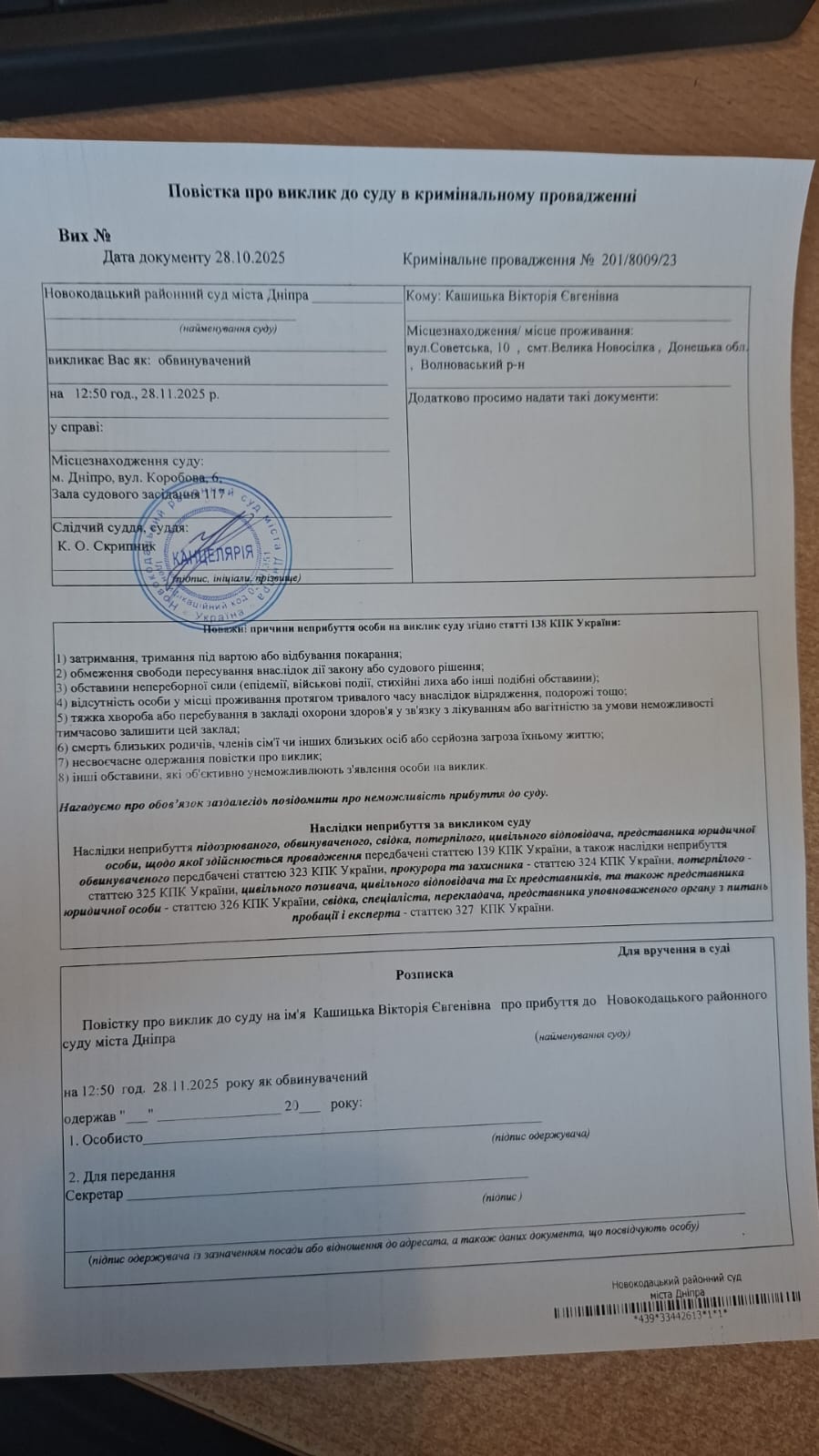 Summons for court appearance of V.E. Kashytska on 28.11.2025