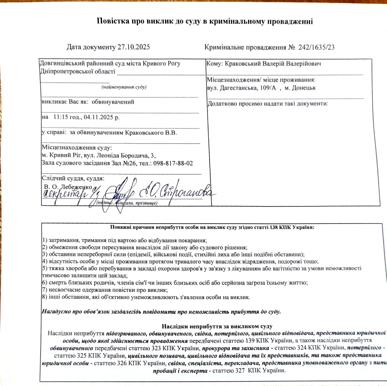 Summons for the court appearance of Krakovskyi V.V. on 04.11.2025