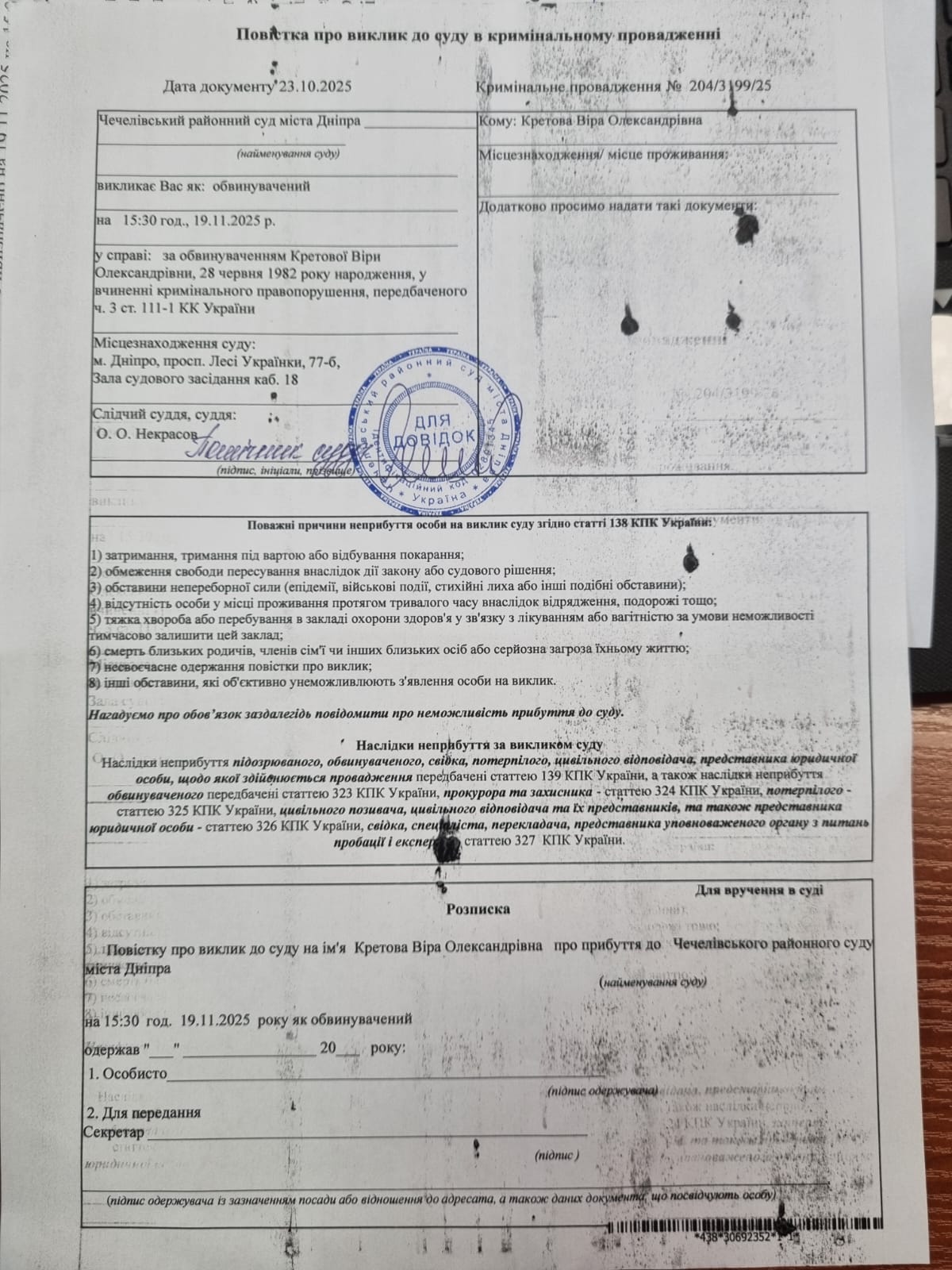 Summons for court appearance of Kretova V.O. on 19.11.2025