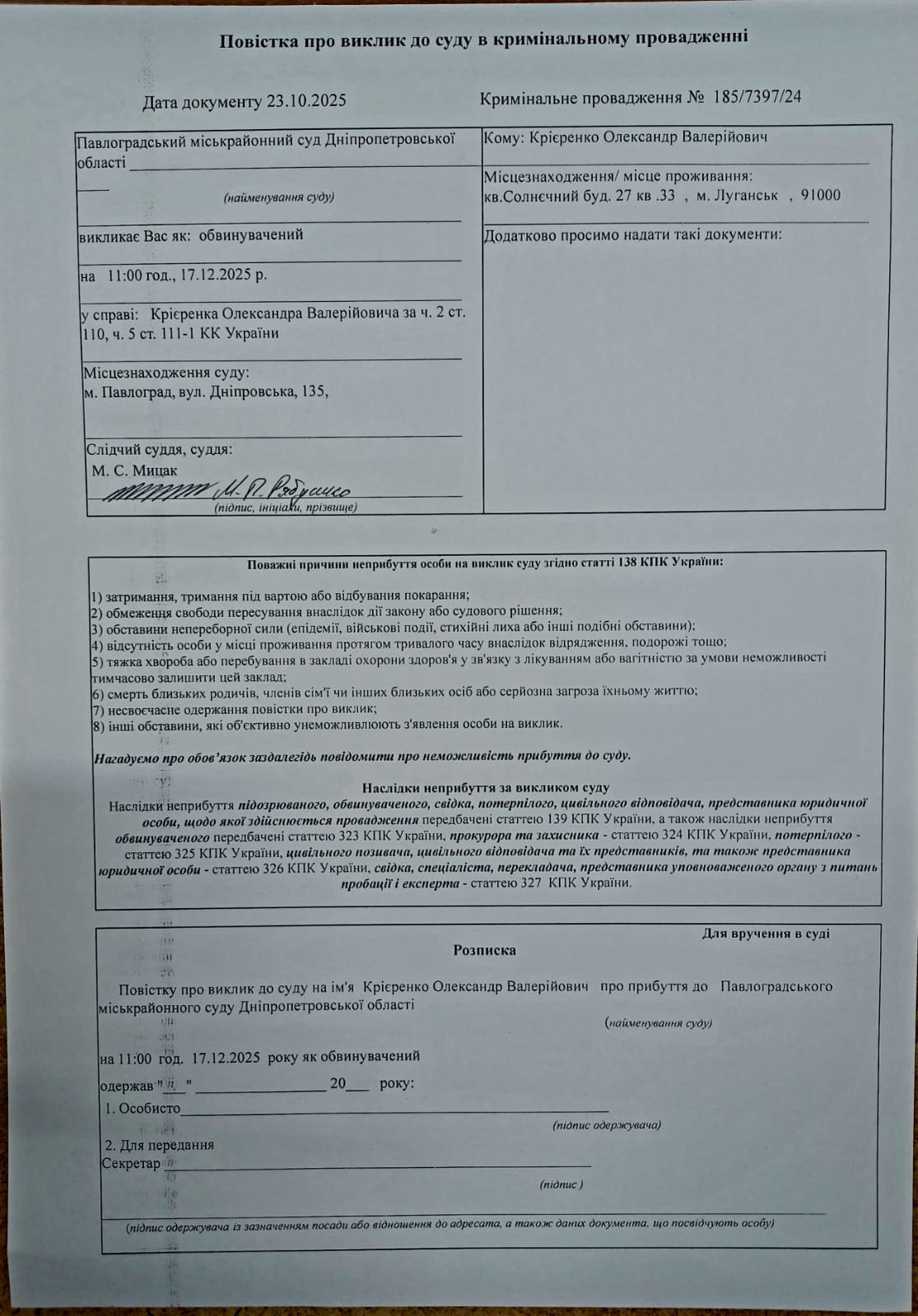 Summons to court for Kriyerenko O.V. on December 17, 2025, at 11:00 AM