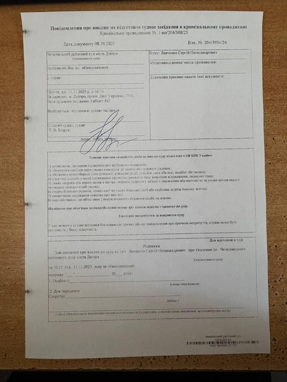 Summons for court appearance of Levchenko S.O. on 11.11.2025