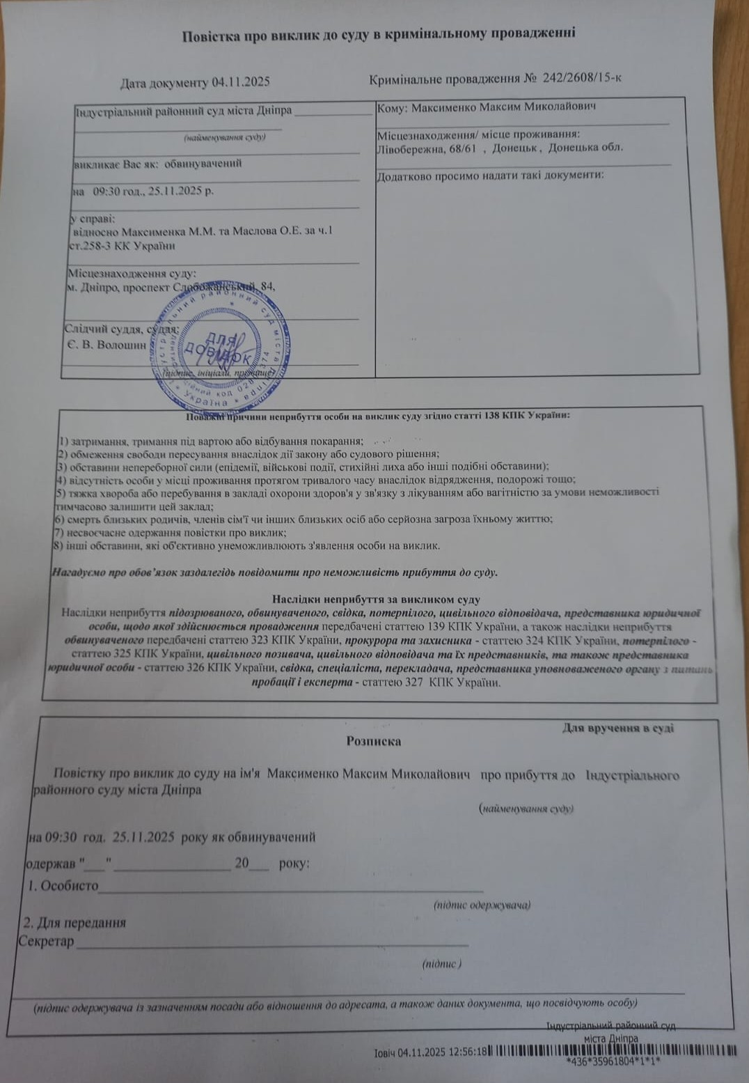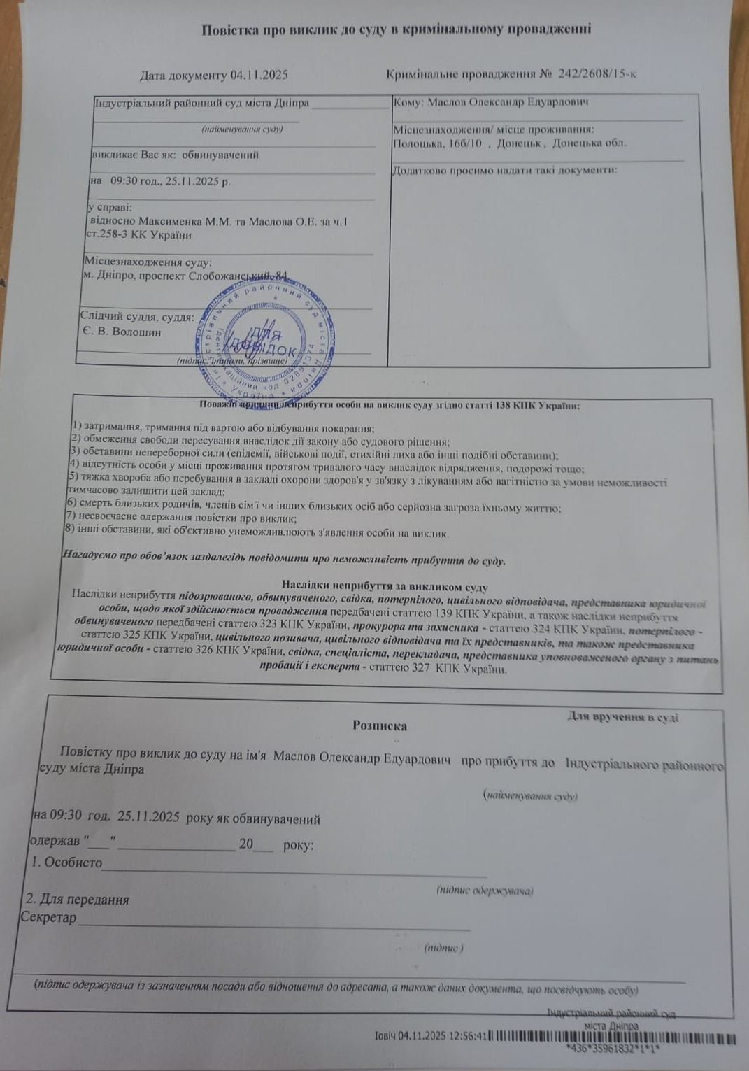 Summons for court appearance of Maksymenko M.M. on 25.11.2025,