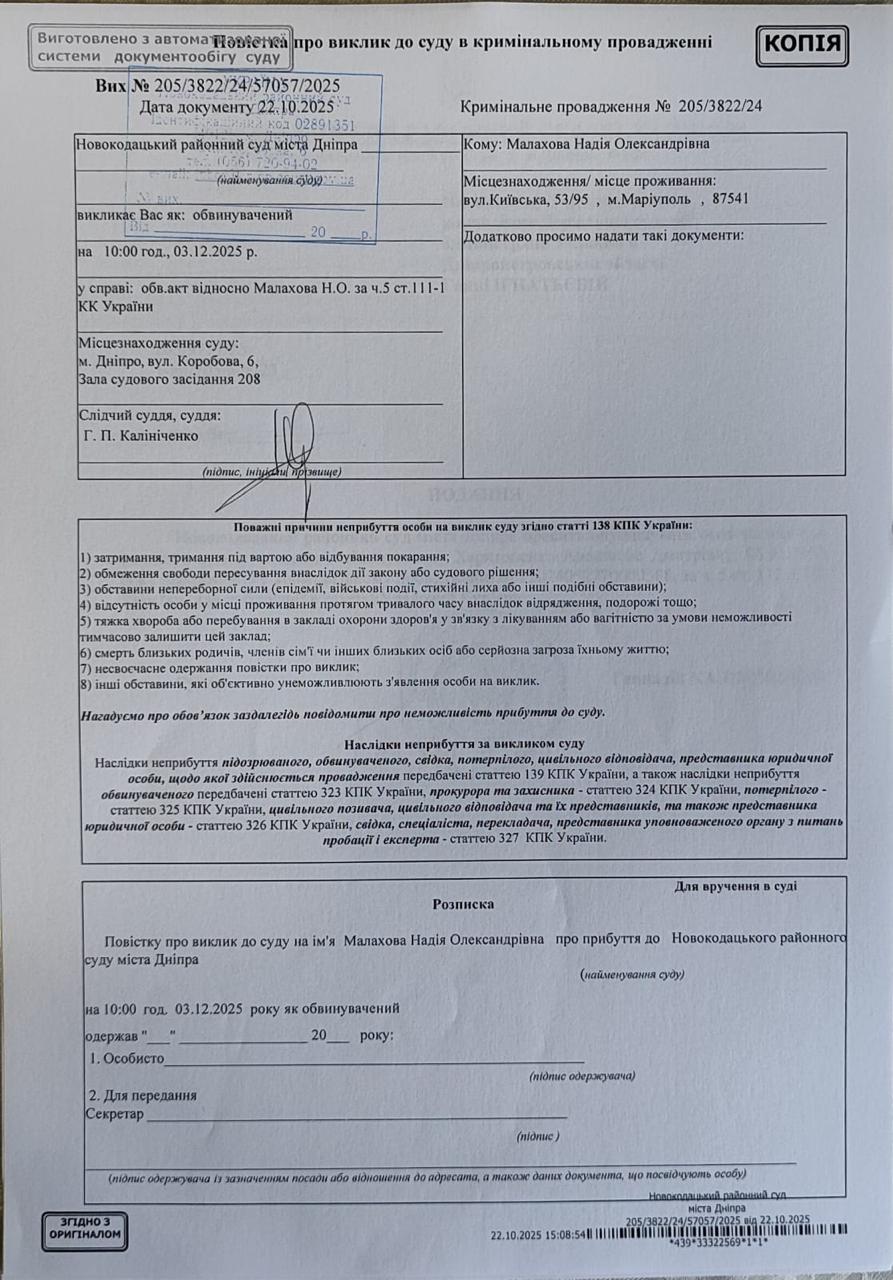 Summons for court appearance of Malakhova N.O. on 03.12.2025