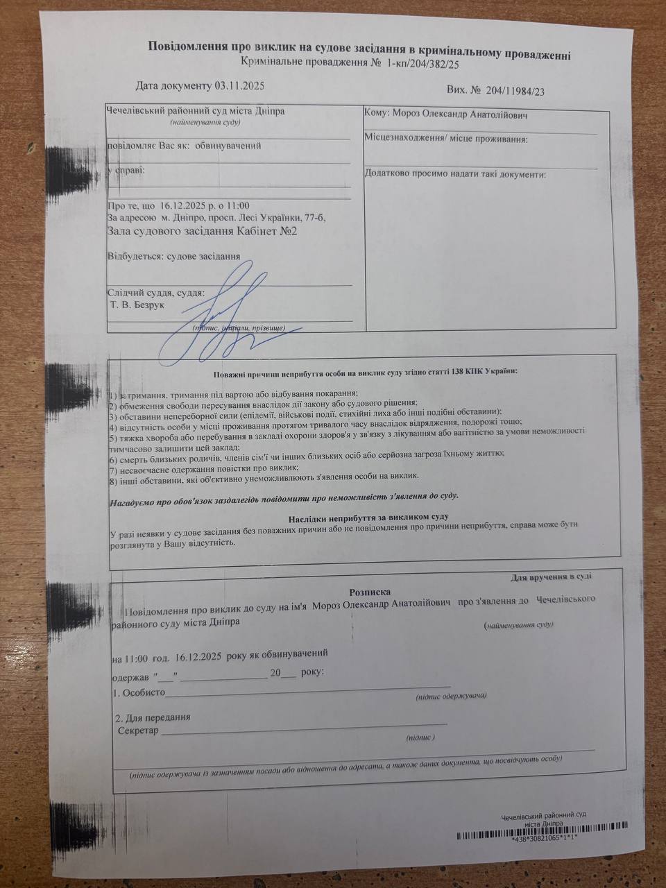 Summons for the court appearance of Moroz O.A. on 16.12.2025