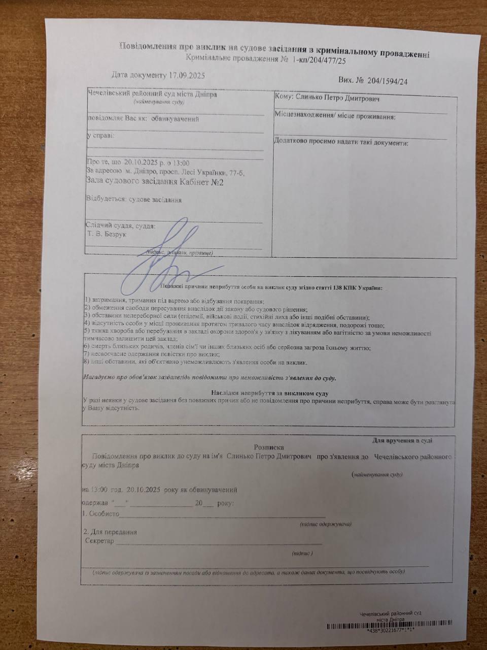 Summons for Slynka P.D. to appear in court on 20.10.2025