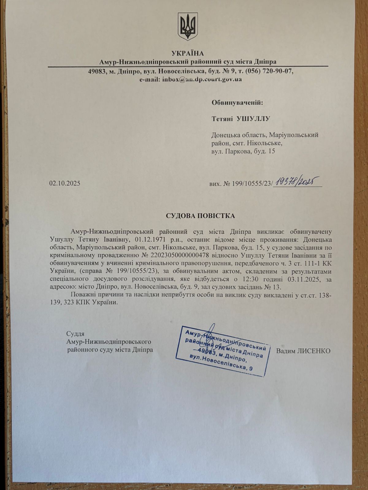 Summons for court appearance for Ushullu T.I. on 03.11.2025