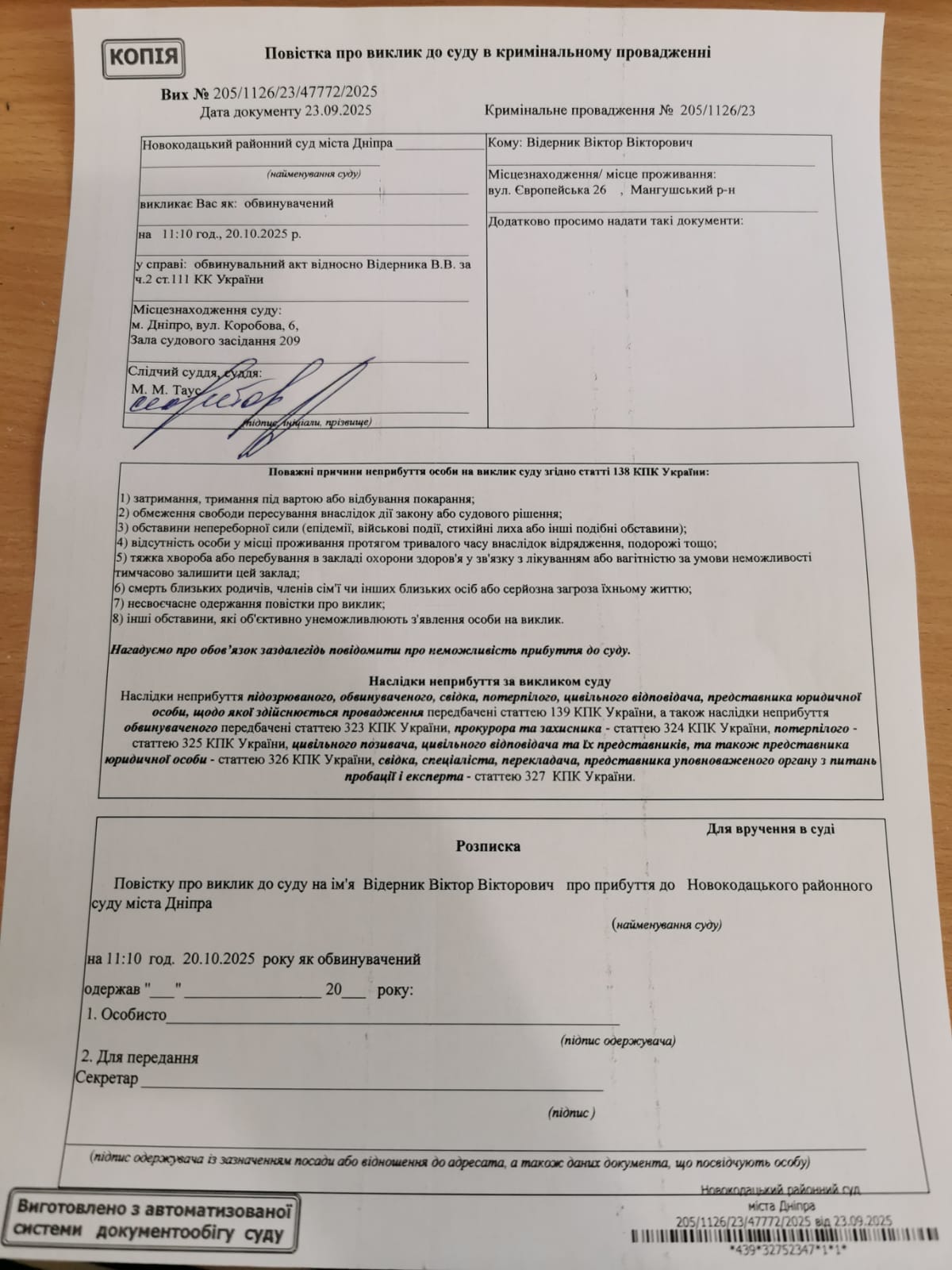 Summons on the summons to the court of Vidernyk V.V. on 20.10.2025