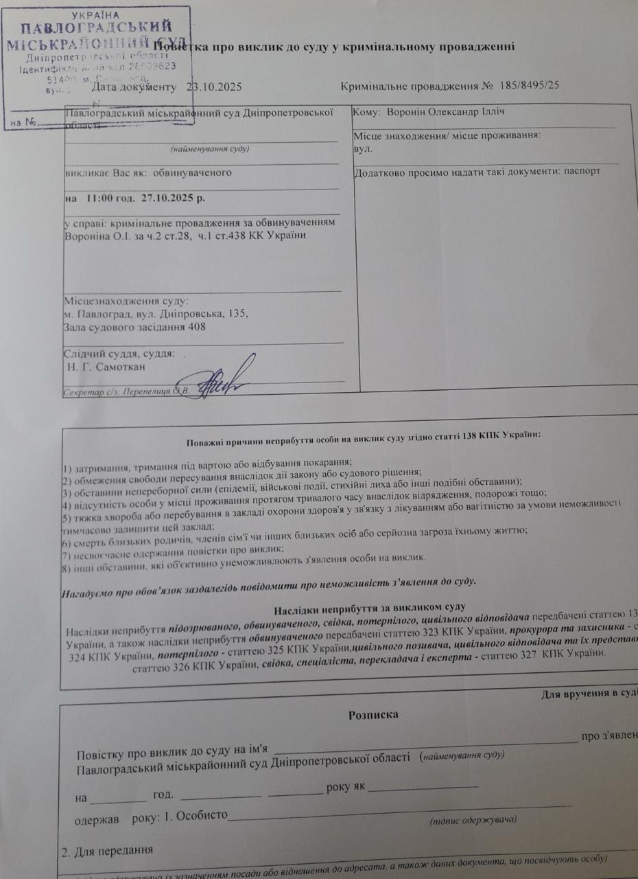 Summons for court appearance of Voronin O.I. on 27.10.2025