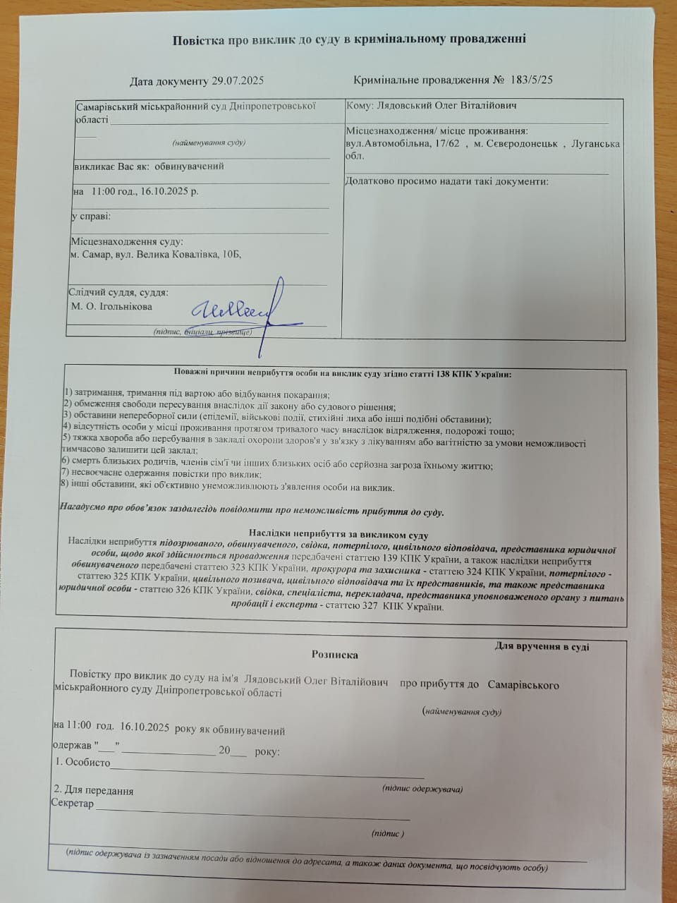 The summons of call to court as an accused Oleg Vitaliyovich Lyadovsky on 16.10.2025 at 11-00 o'clock to the Samara City District Court of Dnipropetrovsk Oblast