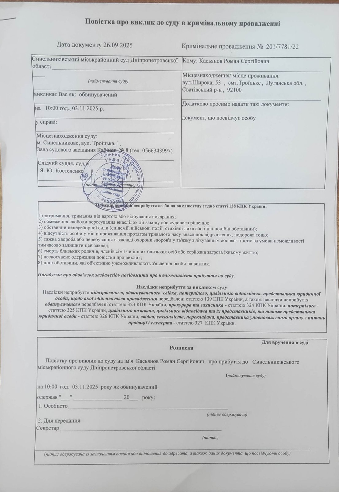 The summons on the call of Kasyanova RS to Sinelnikov City District Court on 03.11.2025