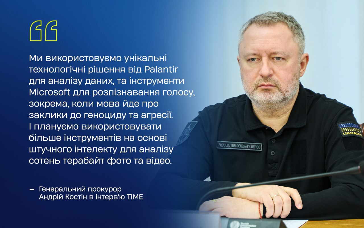 Генеральний прокурор Андрій Костін в інтервʼю TIME розповів про впровадження та використання цифрових технологій в щоденній роботі органів прокуратури задля належного документування, розслідування та забезпечення відповідальності за воєнні злочини рф.
