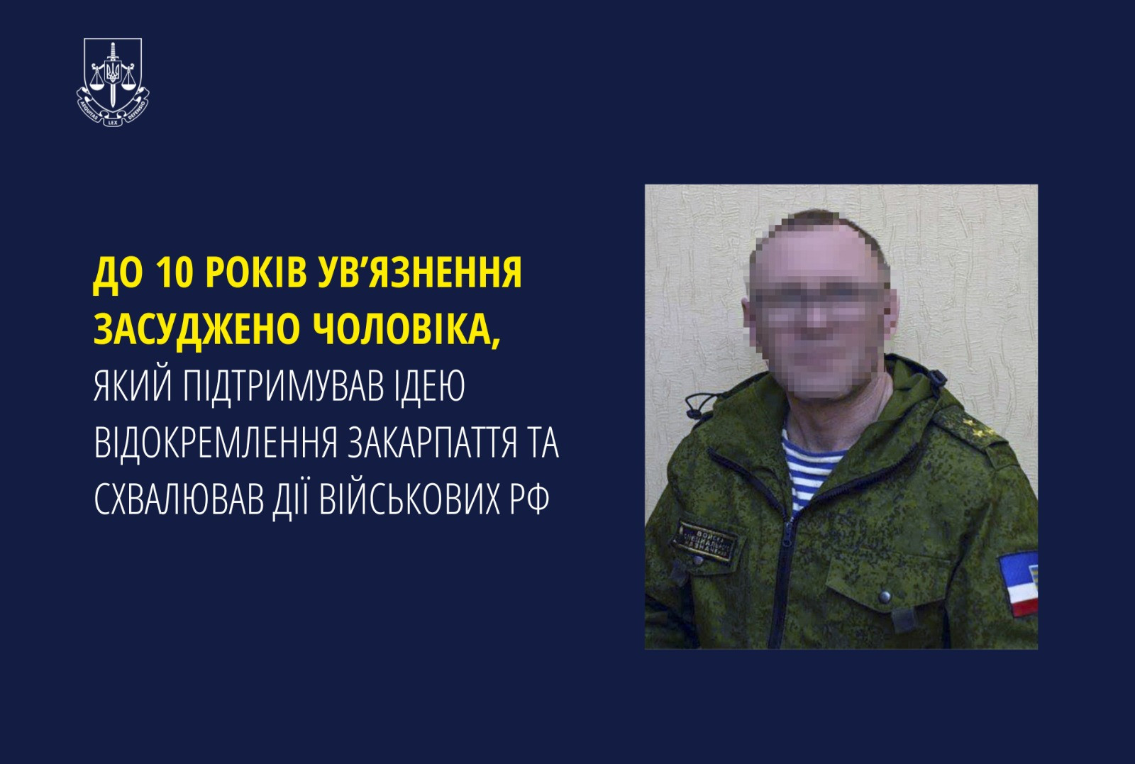 До 10 років ув’язнення засуджено чоловіка, який підтримував ідею відокремлення Закарпаття та схвалював дії військових рф
