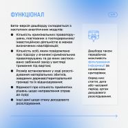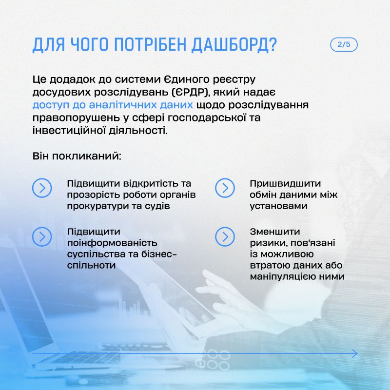 Дашборд – це візуалізований додаток до системи ЄРДР, в якому зібрані і поєднані в зручному для аналізу і сприйняття форматі дані про статистику розслідувань та розгляду в судах справ.