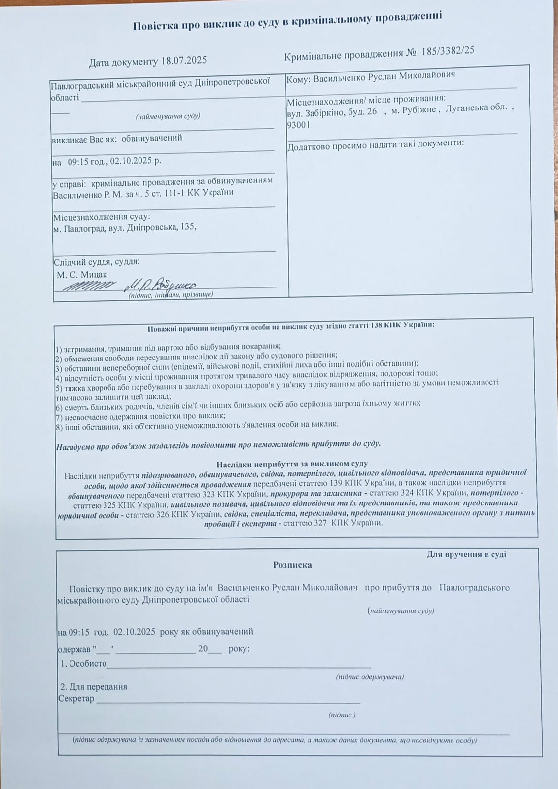 Повістка про виклик до Павлоградського міськрайонного суду Дніпропетровської області обвинуваченого Васильченка Руслана Миколайовича на 02.10.2025 на 09:15 год.