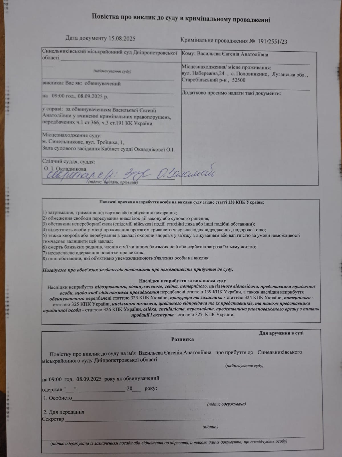 Повістка про виклик до Синельниківського міськрайонного суду Дніпропетровської області обвинуваченої Васильєвої Євгенії Анатоліївни на 09-00 год 08.09.2025