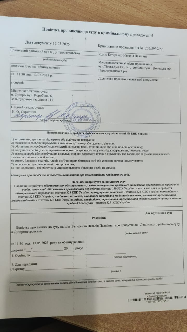 Повістка про виклик до суду Батиренко Н.П. на 13.05.2025