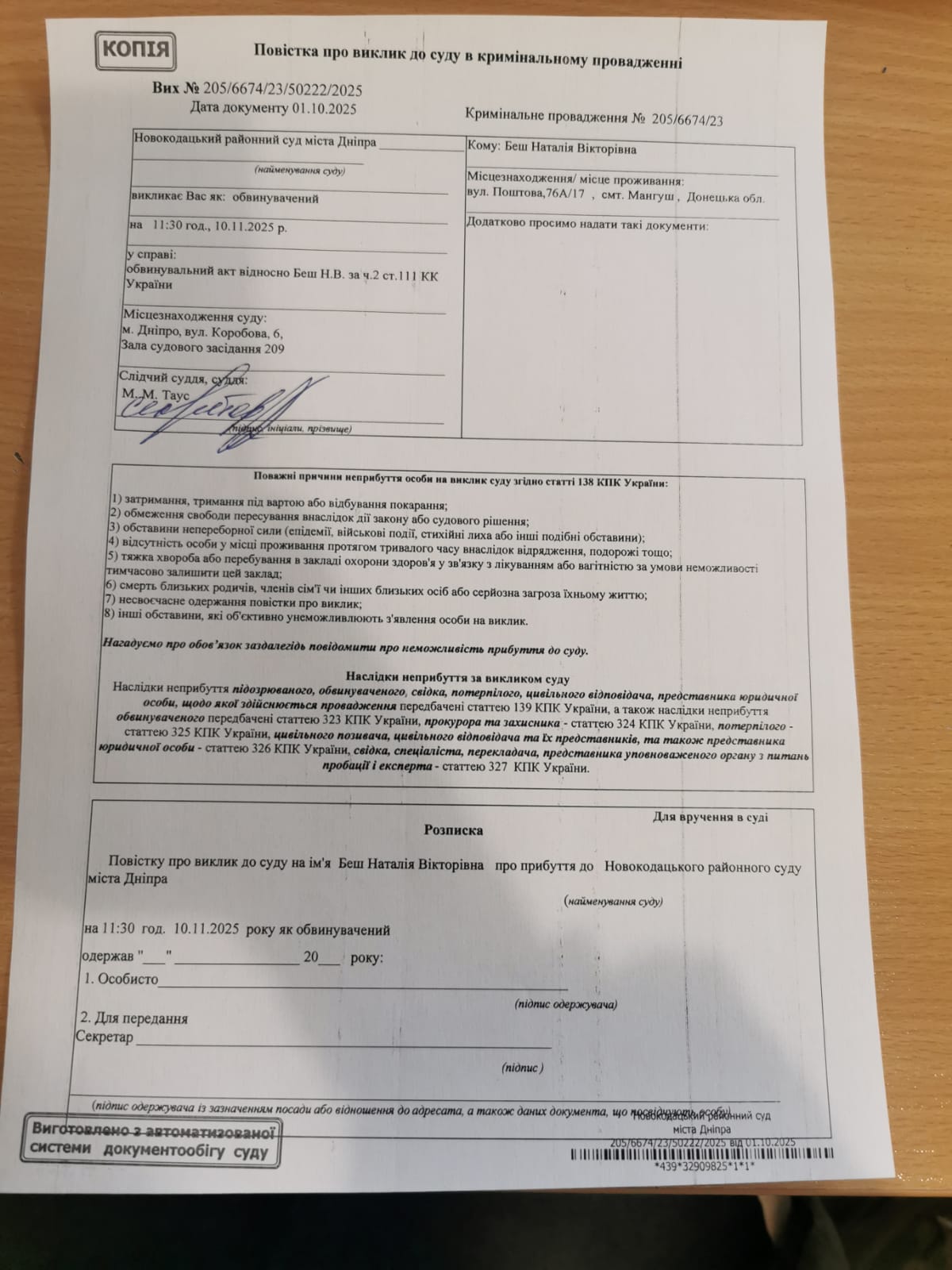 Повістка про виклик до суду Беш Н.В. на 10.11.2025