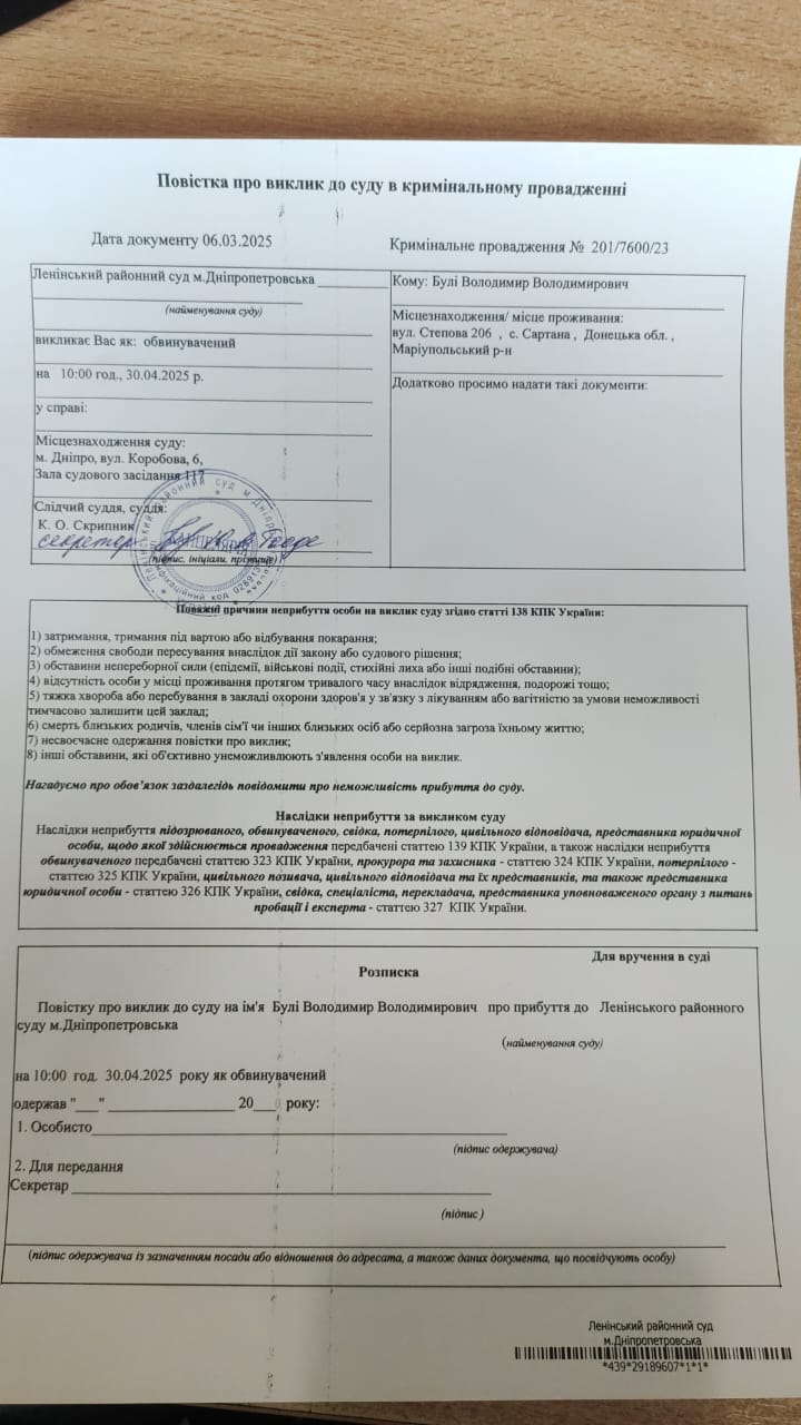 Повістка про виклик до суду Булі В.В. на 30.04.2025