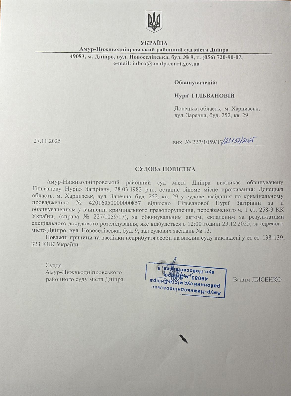 Повістка про виклик до суду Гальчука Г.П. на 23.12.2025