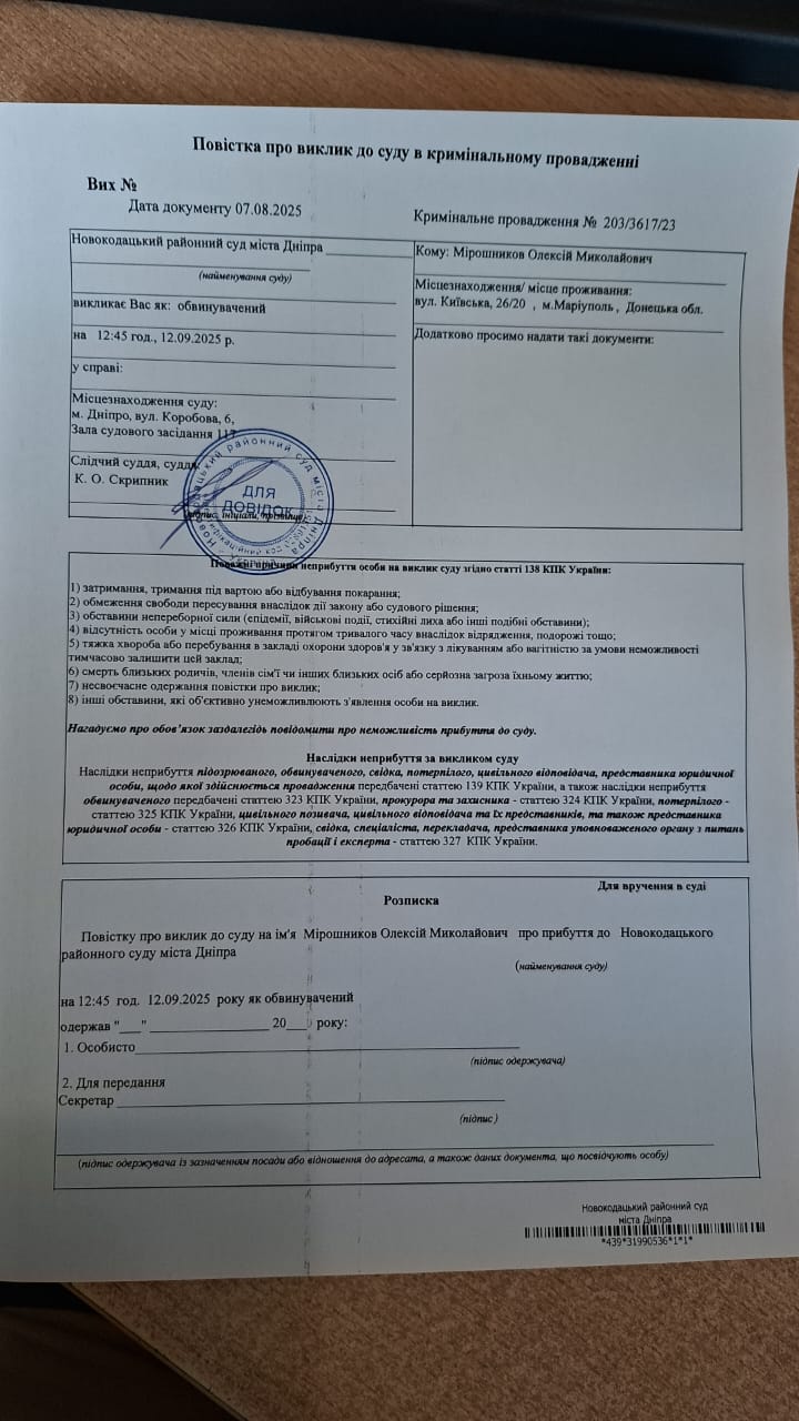 Повістка про виклик до суду Мірошникова О.М. на 12.09.2025
