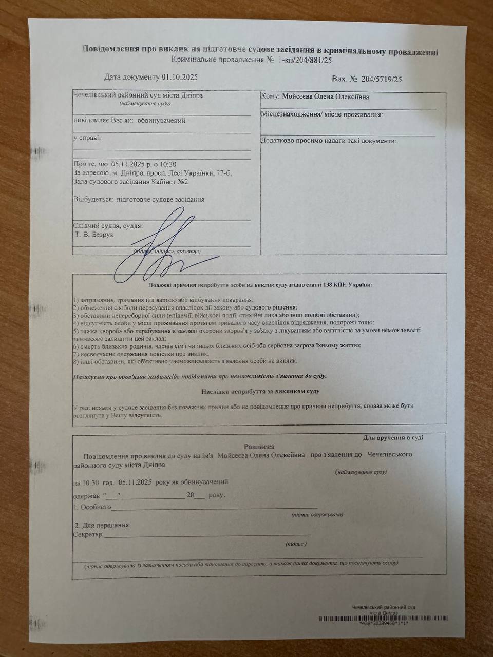 Повістка про виклик до суду Мойсеєвої О.О. на 05.11.2025