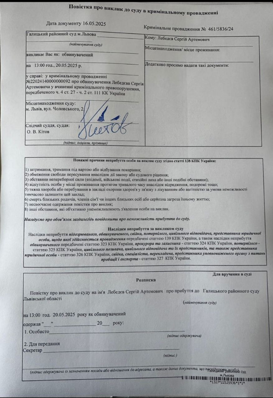 Повістка про виклик до суду обвинуваченого Лебедєва СА. на 20.05.2025, 13:00 год