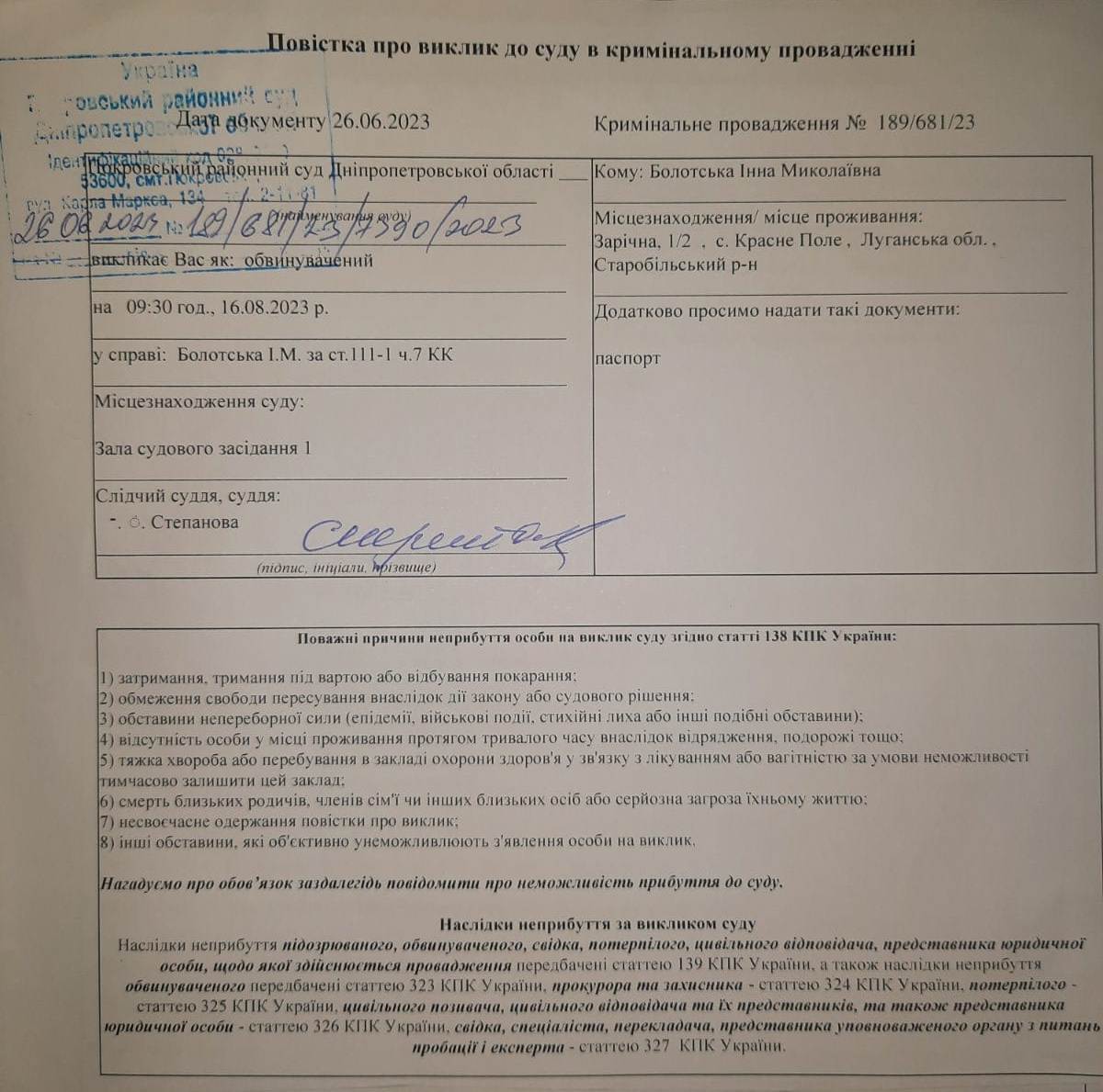 Повістка про виклик до суду обвинуваченої Болотської І.М. на 09 год. 30 хв. 16.08.2023