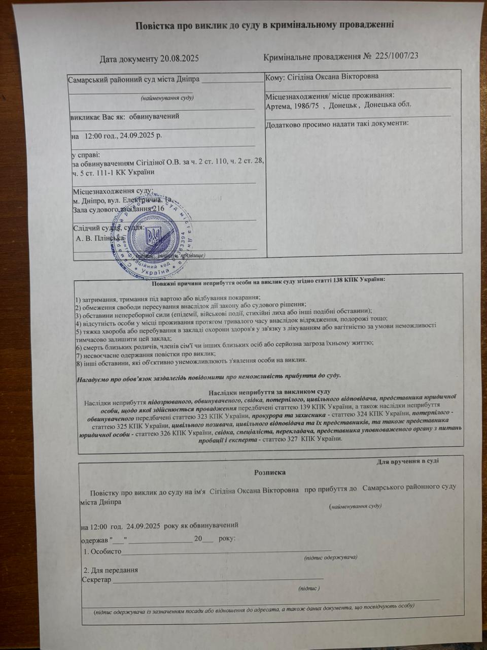 Повістка про виклик до суду Сігідіної О.В. на 24.09.2025
