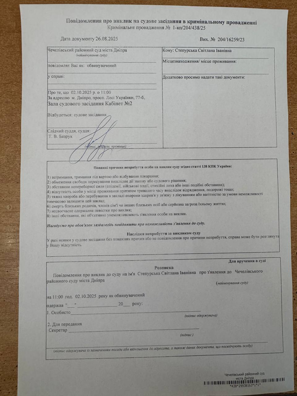 Повістка про виклик до суду Степурської С.І. на 02.10.2025
