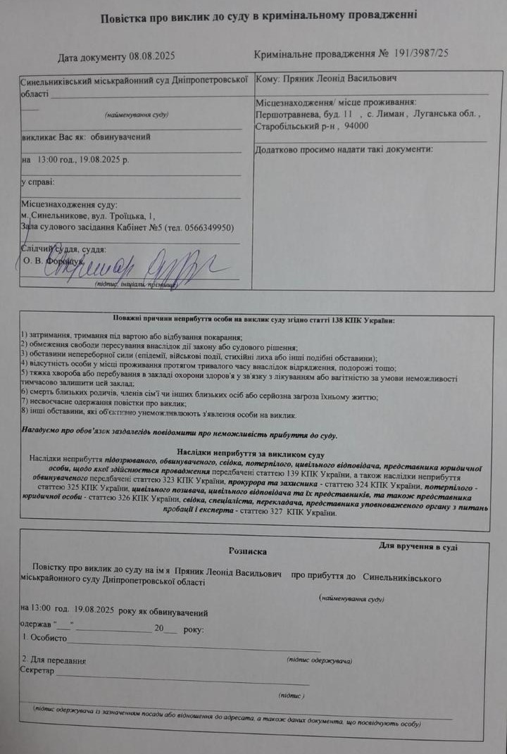 Повістка про виклик обвинуваченого Пряника Л.В. до Синельниківського міськрайонного суду Дніпропетровської області на 19.08.2025