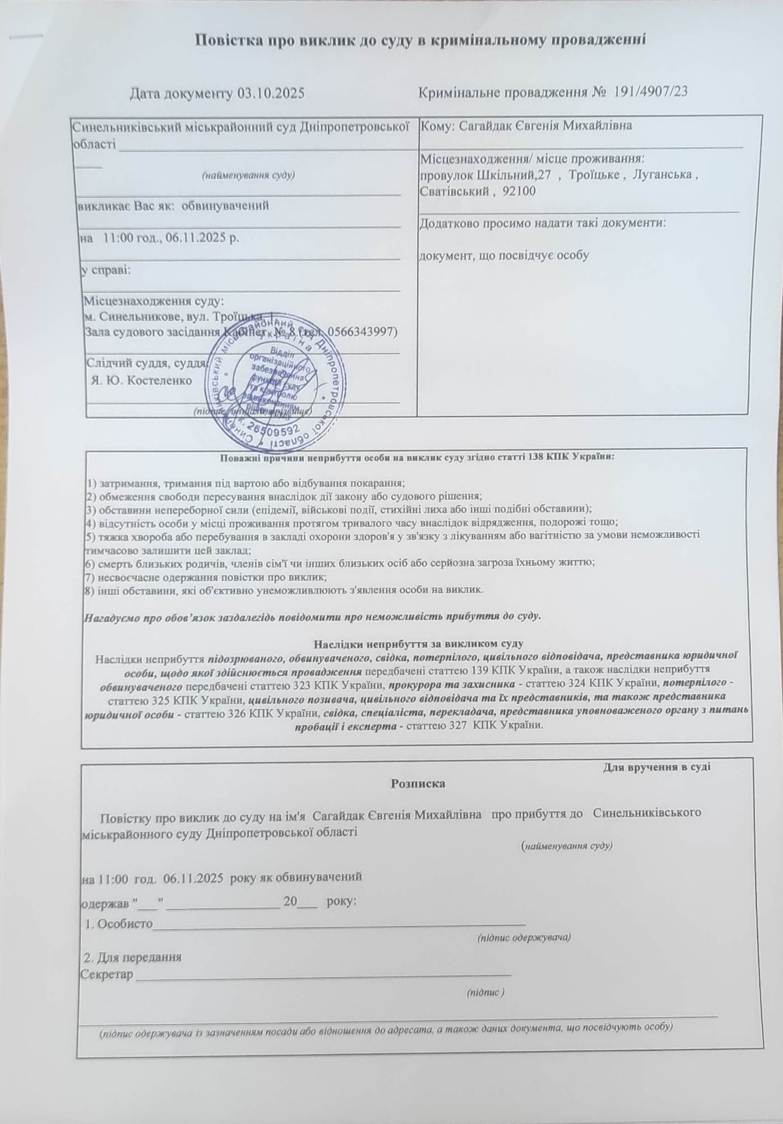 Повістка про виклик Сагайдак Є.М. на 06.11.2025 до Синельниківського міськрайонного суду Дніпропетровської області