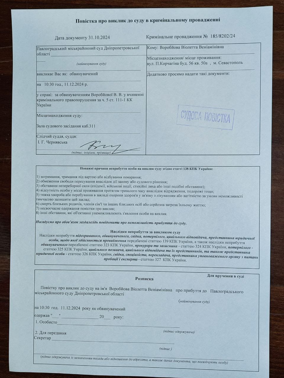 Повістка про виклик Воробйової В.В. в суд на 11.12.24 на 10.30
