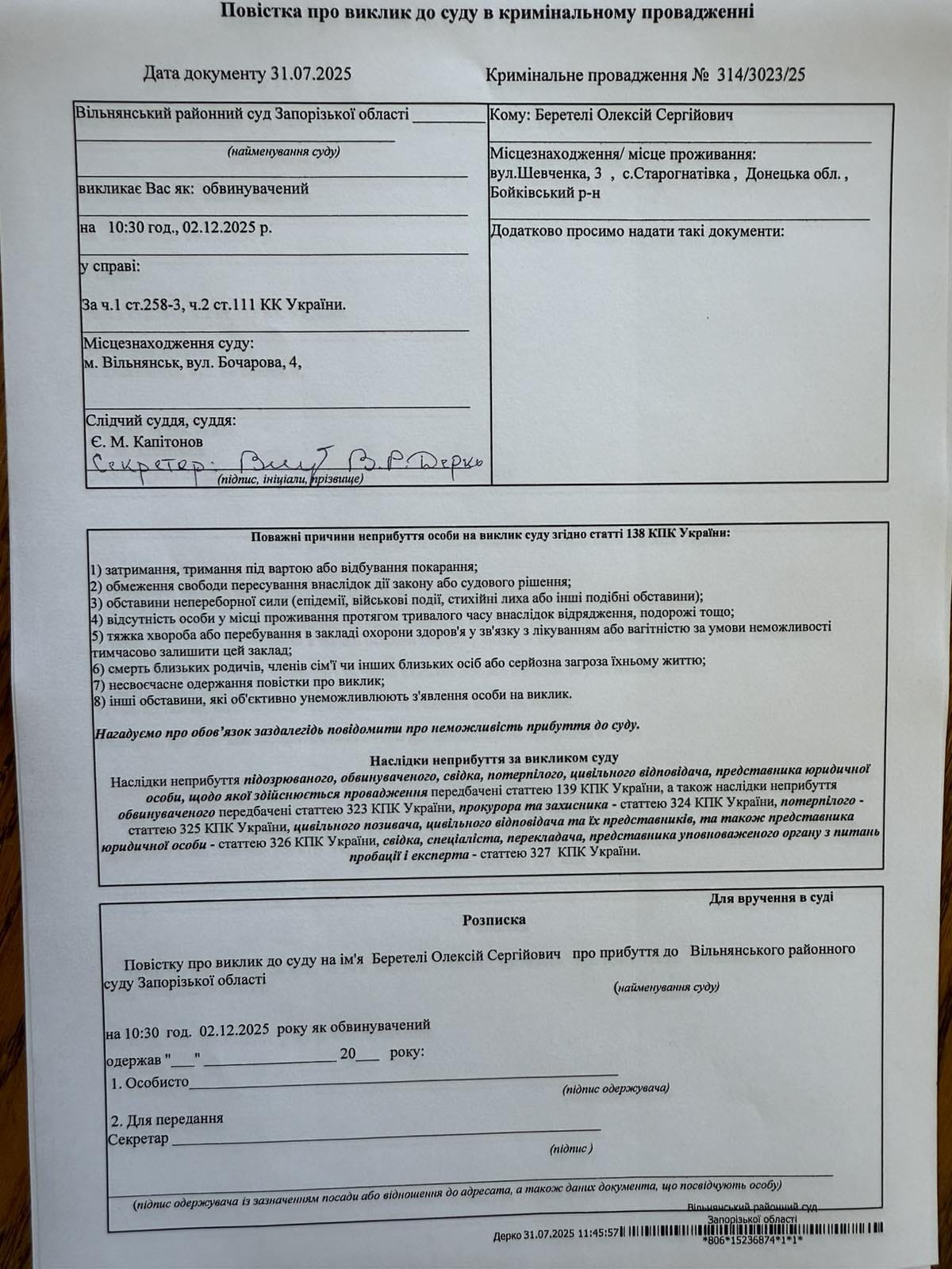 Повістки про виклик до суду Беретелі О.С. на 02.12.2025,
