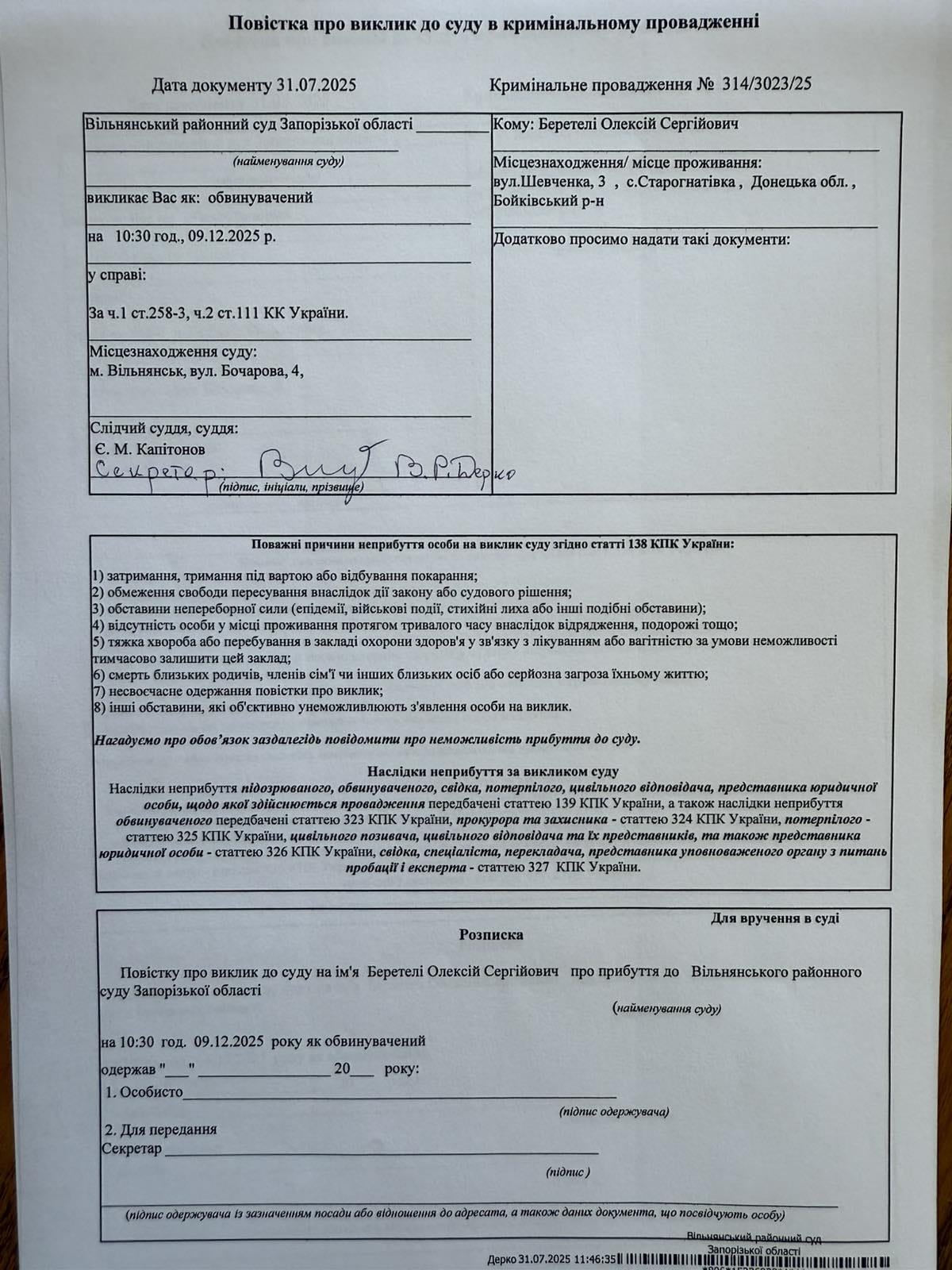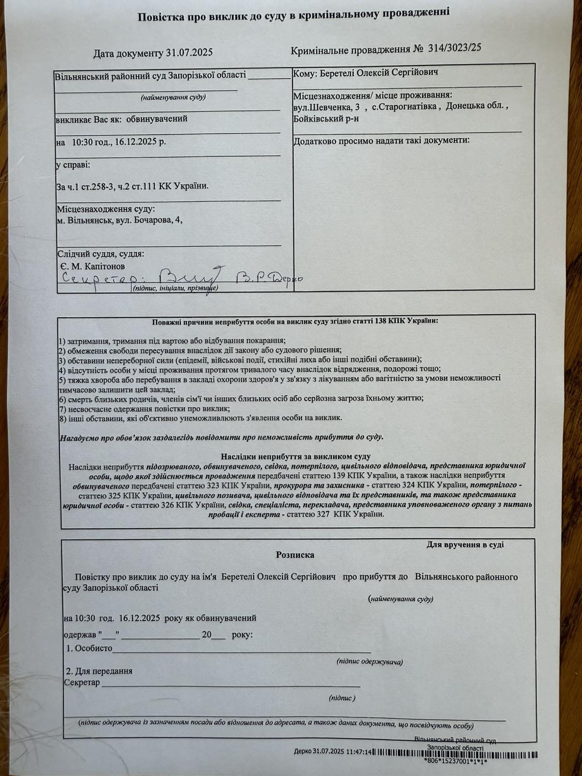 Повістки про виклик до суду Беретелі О.С. на 16.12.2025