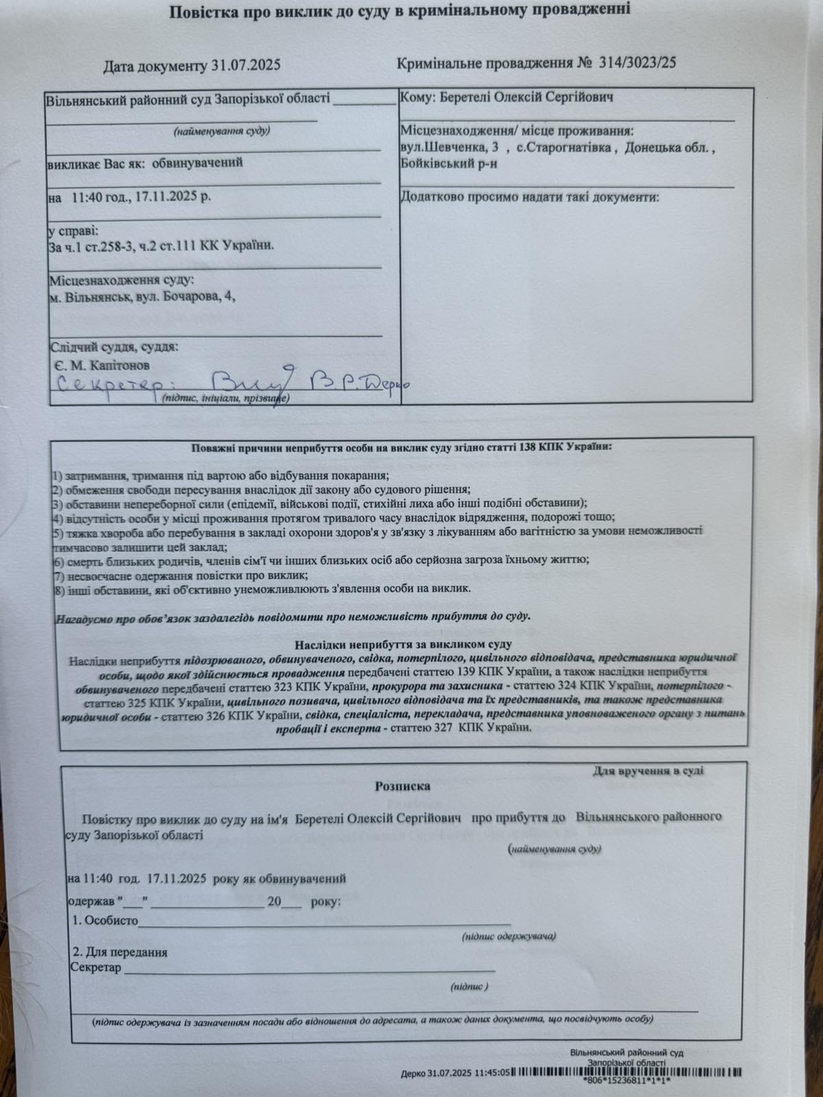 Повістки про виклик до суду Беретелі О.С. на 17.11.2025,