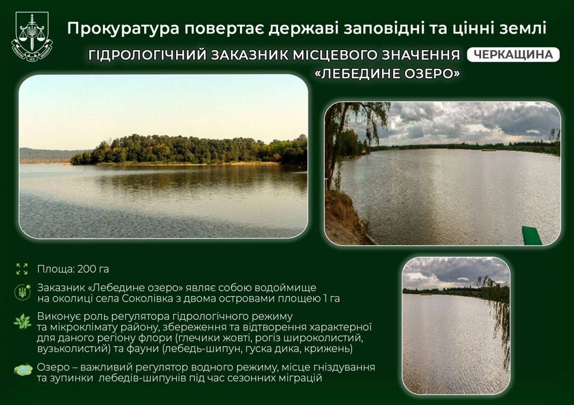 Прокуратура вступила в судову справу для захисту території гідрологічного заказника місцевого значення «Лебедине озеро». Земельну ділянку і водне плесо площею понад 200 га передано в оренду місцевому підприємству для рибогосподарських потреб, що не відповідає меті створення заповідного об’єкту. Наразі суд відкрив провадження в інтересах держави до Жашківської міської ради та ТОВ.