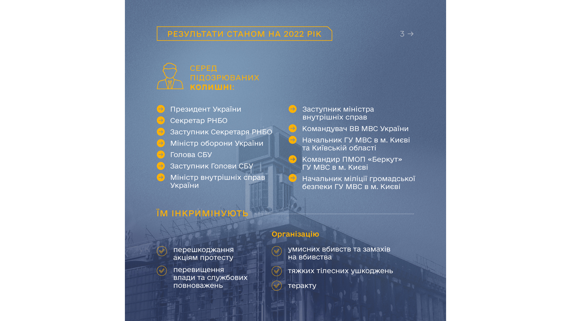 Попри виклики, пов’язані з воєнною агресією, у 2022 році за процесуального керівництва прокурорів профільного Департаменту Офісу Генерального прокурора повідомлено про підозру 27 особам, з яких на час вчинення інкримінованих їм злочинів: 2 високопосадовці, 17 правоохоронців, в числі яких 2 прокурора та 1 слідчий, 1 суддя, 7 цивільних осіб.