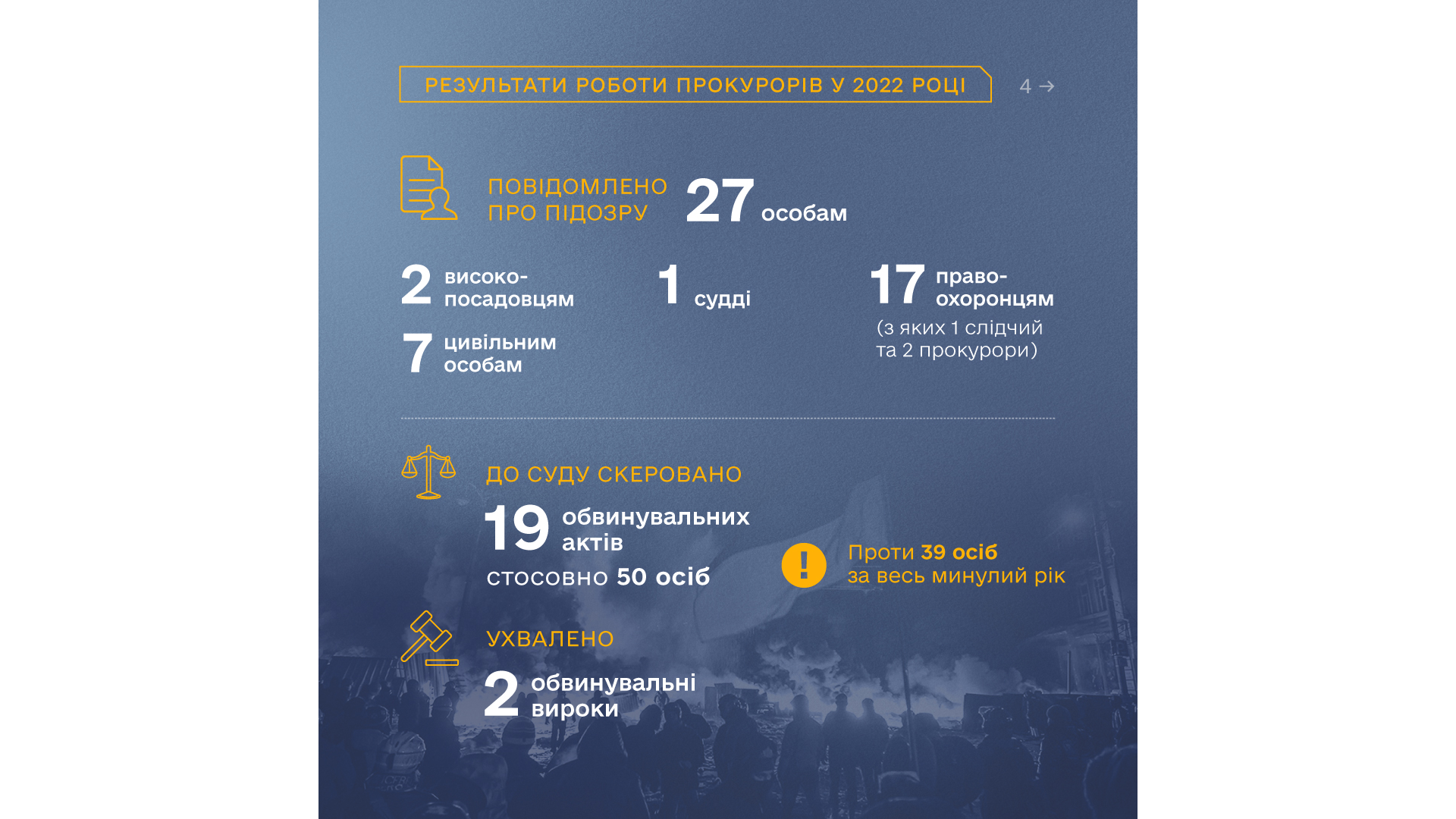 Попри складнощі, викликані війною, за результатами 10 місяців роботи прокурорів та слідчих майже на чверть у порівнянні з попереднім роком зросла кількість осіб, щодо яких обвинувальні акти направлено до суду. 19 обвинувальних актів стосовно 50 осіб. Серед них 3 високопосадовці, 1 суддя, 28 правоохоронців, у тому числі 3 прокурори та 7 слідчих, а також 18 цивільних осіб.