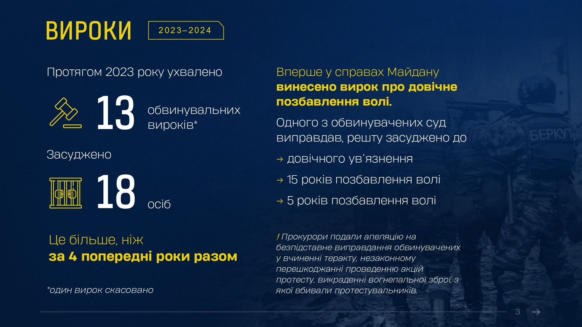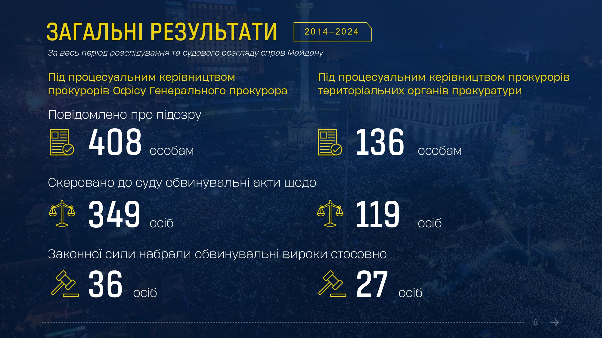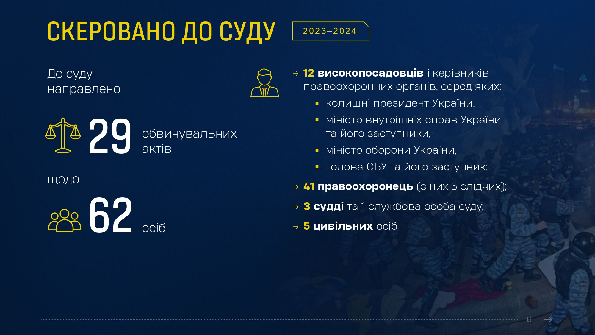 Олексій Донський відмітив прогрес, досягнутий в ухваленні вироків протягом минулого року порівняно з попередніми періодами. «Після майже 8 років судового розгляду ми отримали довгоочікуваний вирок щодо безпосередніх виконавців масових розстрілів беззбройних протестувальників на Інститутській в Києві 20 лютого 2014 року. Одного з них вперше у справах Майдану засуджено до довічного позбавлення волі», – зазначив начальник Департаменту. «А загалом лише у 2023 році у справах Майдану судами ухвалено 13 обвинувальних вироків, якими засуджено 18 осіб – більше, ніж за 4 попередні роки разом», - додав він.
