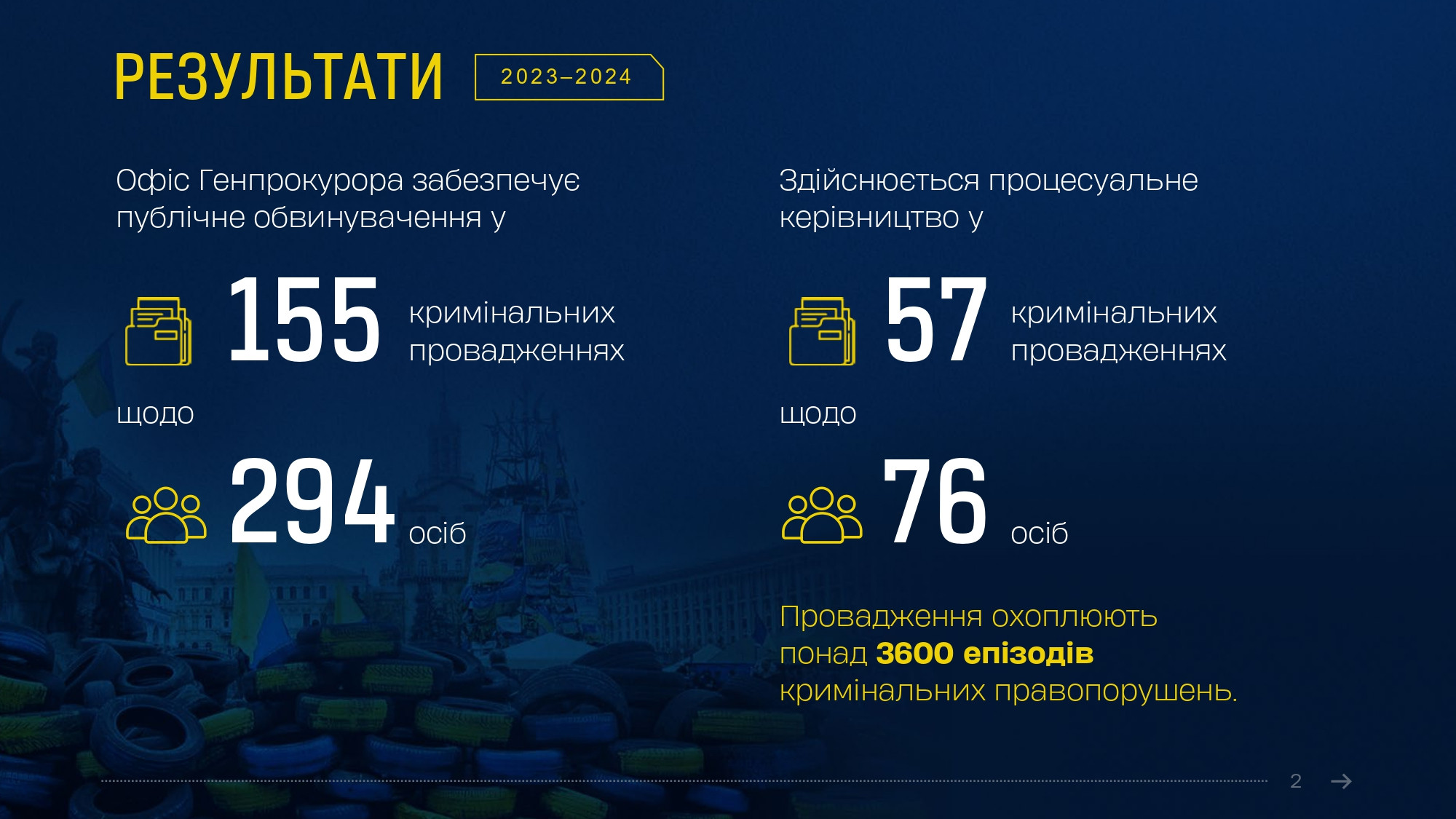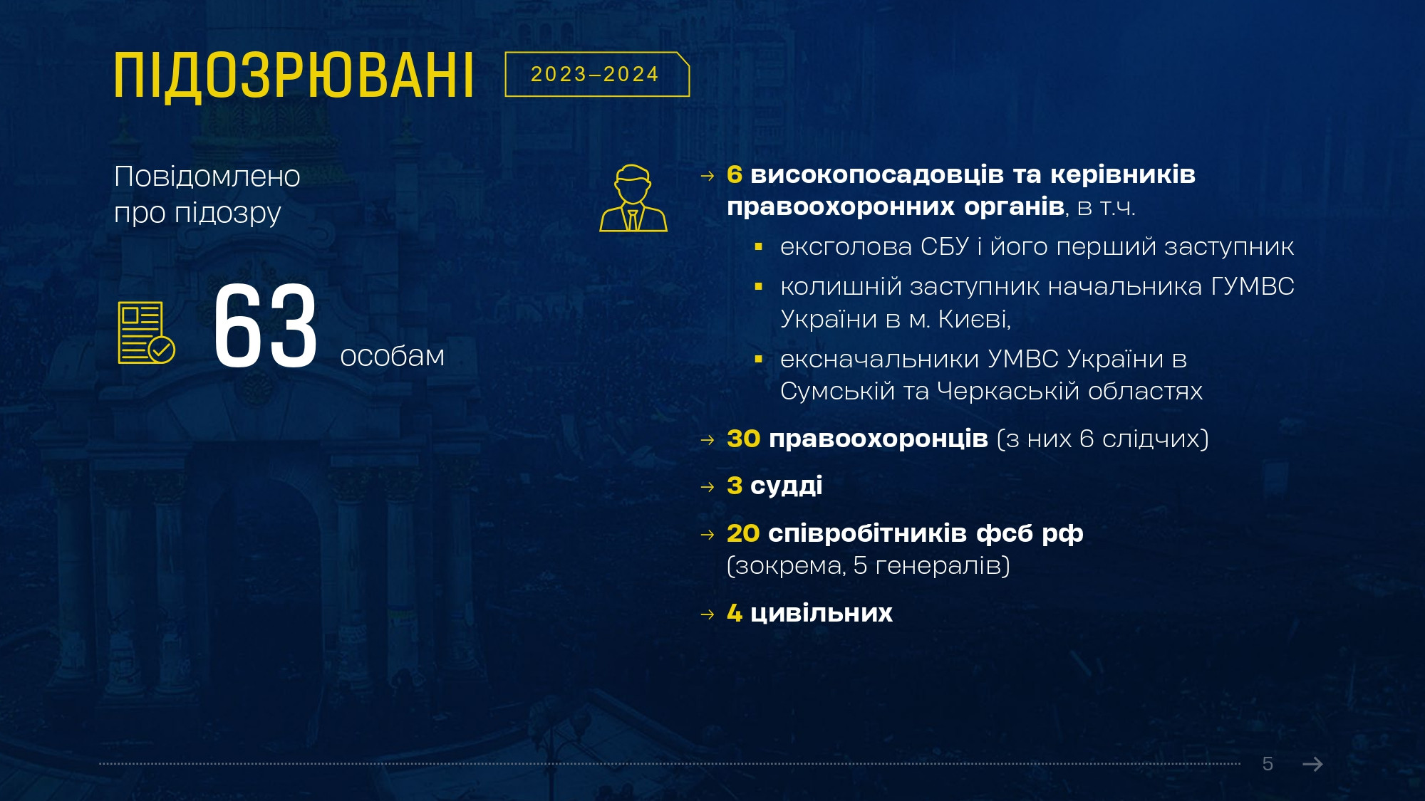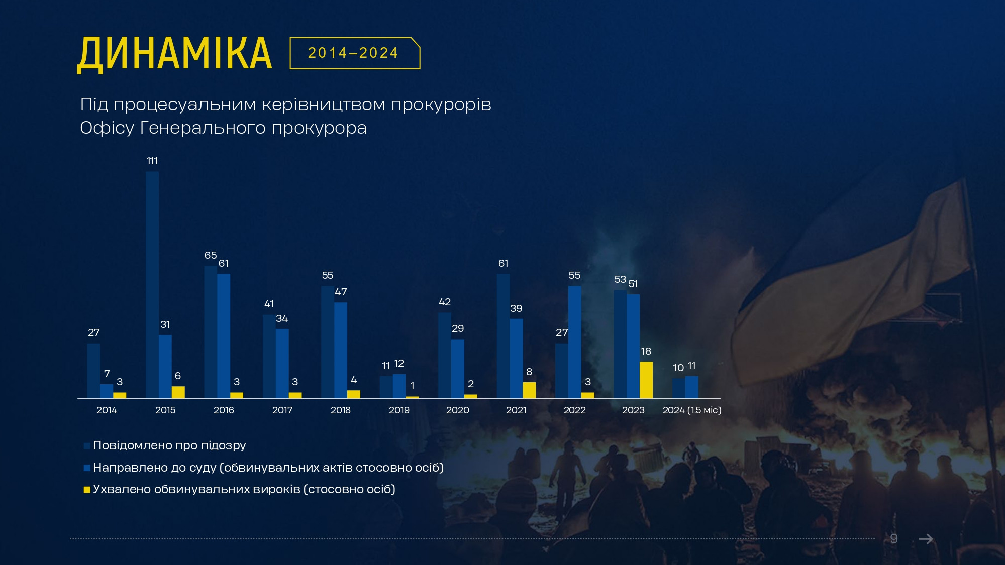 Олексій Донський відмітив прогрес, досягнутий в ухваленні вироків протягом минулого року порівняно з попередніми періодами. «Після майже 8 років судового розгляду ми отримали довгоочікуваний вирок щодо безпосередніх виконавців масових розстрілів беззбройних протестувальників на Інститутській в Києві 20 лютого 2014 року. Одного з них вперше у справах Майдану засуджено до довічного позбавлення волі», – зазначив начальник Департаменту. «А загалом лише у 2023 році у справах Майдану судами ухвалено 13 обвинувальних вироків, якими засуджено 18 осіб – більше, ніж за 4 попередні роки разом», - додав він.