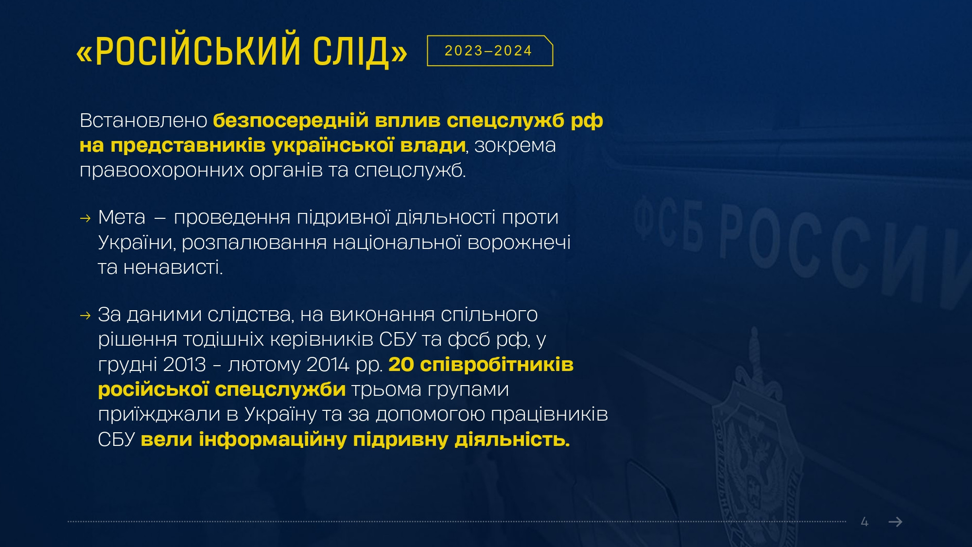 Він нагадав, що вже повідомлено про підозру 20 співробітникам фсб рф, а також ексспівробітникам СБУ, які спільно взаємодіяли в інформаційній діяльності. «20 співробітників фсб, серед яких п’ятеро генералів, кілька разів приїжджали в Україну і спільно зі співробітниками СБУ робили відповідні інформаційні матеріали, які ставали підставою для вчинення тих чи інших злочинних дій», - пояснив начальник Департаменту.