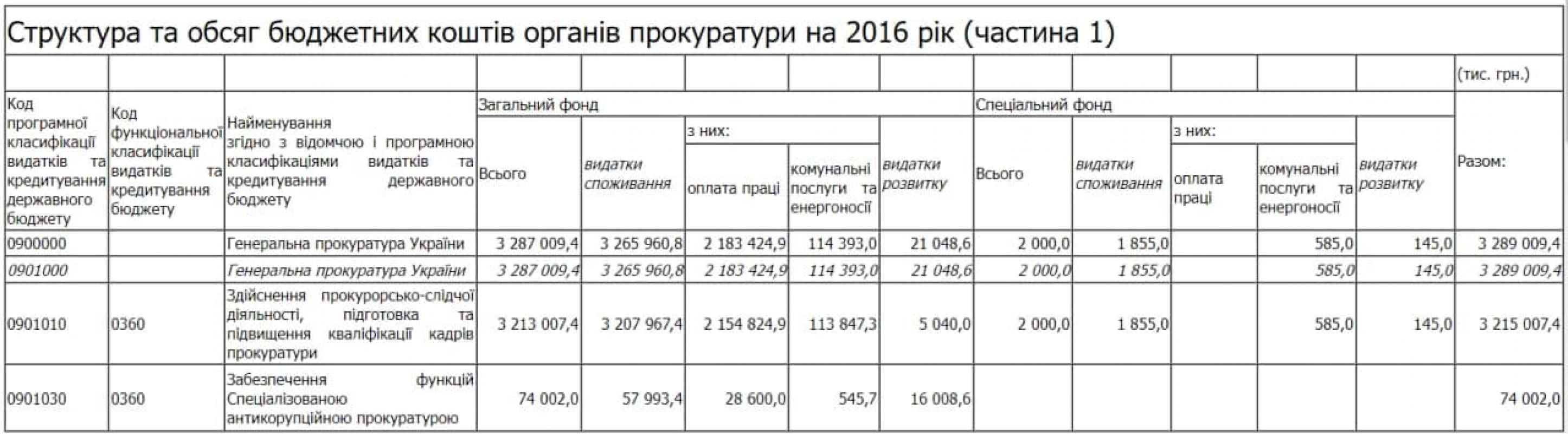 Сруктура та обсяг бюджетних коштів органів прокуратури на 2016 рік (частина 1)